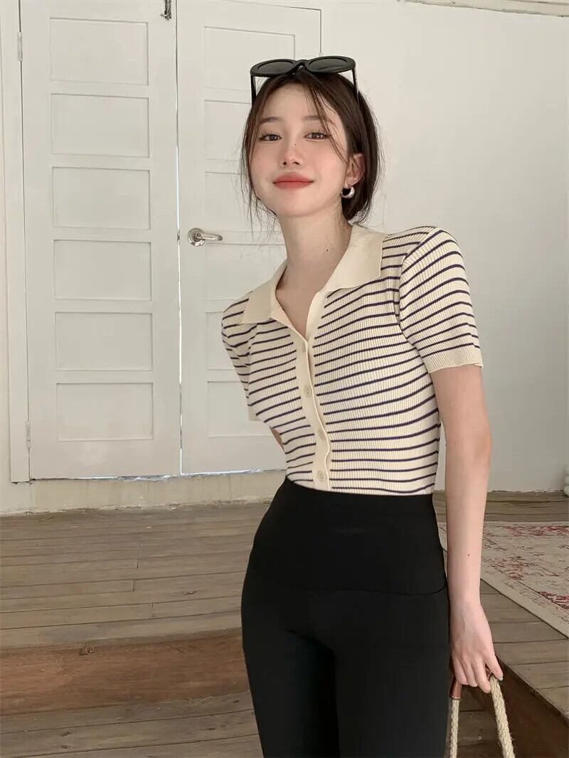 2024 半袖ターンダウン襟ストライププル多用途ボタンレトロスリムフィットニットカーディガンセーター Y2k シャツ ハーフスリーブ