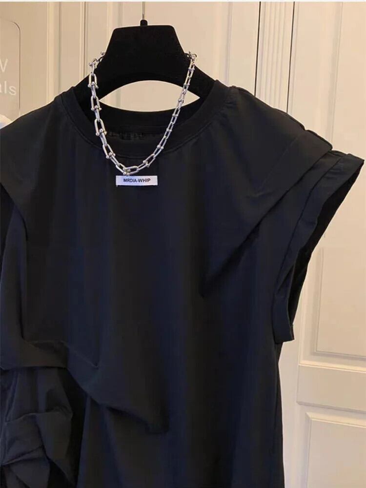 グラフィック Tシャツブラックホワイト特大不規則プリーツノースリーブコットン Tシャツ Ropa Y2k クロップトップグランジ