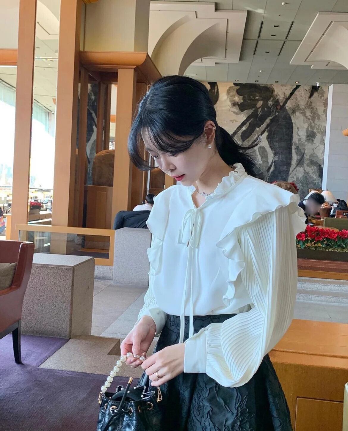 レースアップブラウス木耳プリーツシャツトップ Roupas 春夏 スプリング 春物 サマー 夏物