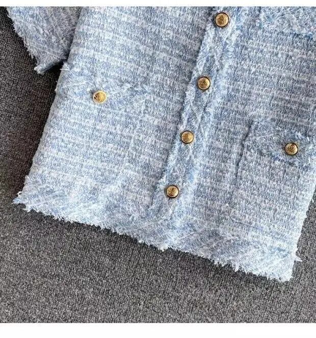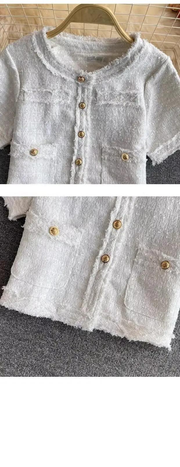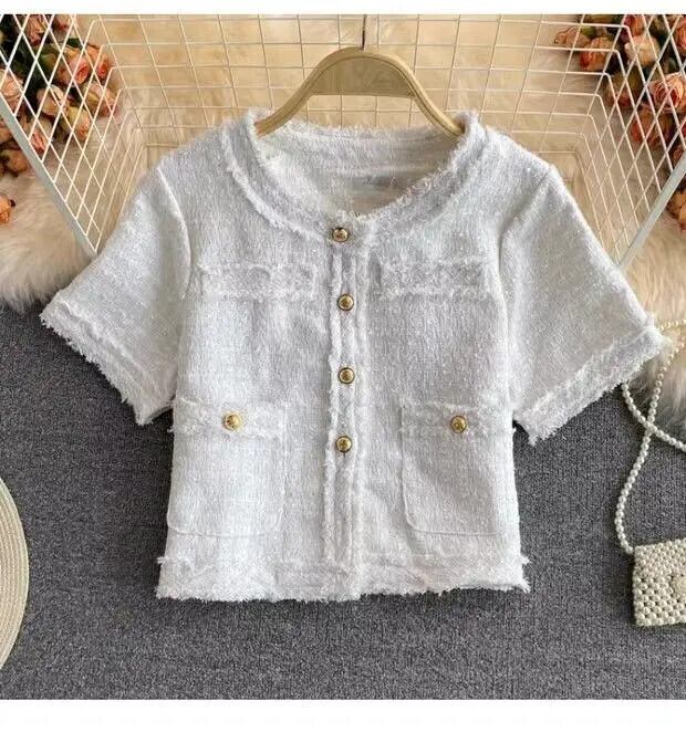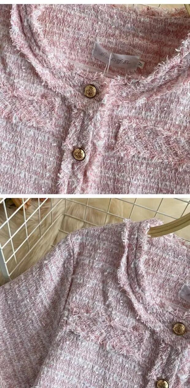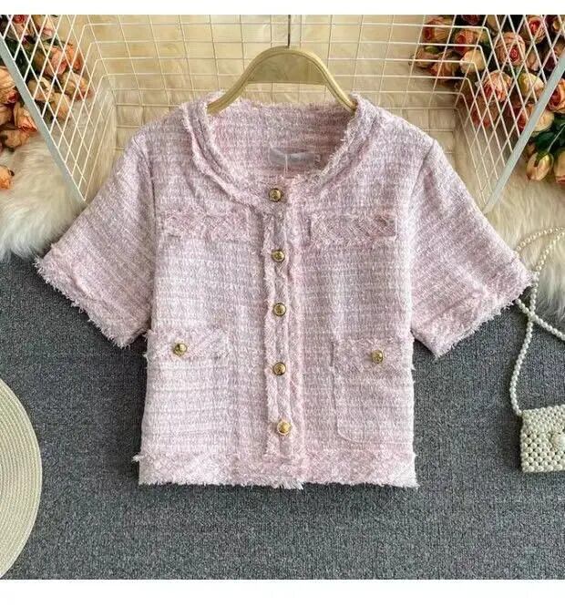 夏薄い気質半袖コートピンクツイードトップ Jaquetas Chaquetas 作物 Tels ブレザージャケット ショート ハーフスリーブ サマー 夏物