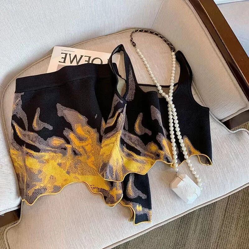 タンクキャミソール夏レトロスパイシーガールズコントラストプリントベスト不規則ツーピースセットニットスカートスーツビーチ衣装 Y2k ファルダス サマー 夏物