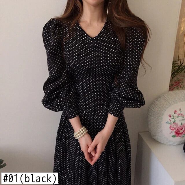 気質 V ネック スリム フィット ウエスト レースアップ プリーツ ランタン スリーブ ポルカ ドット ドレス 赤 黒 Vestidos デ レッド ブラック ランタンスリーブ Vネック