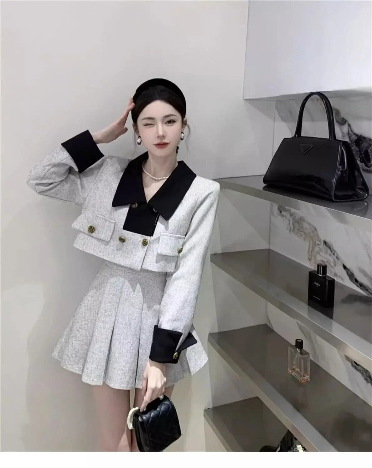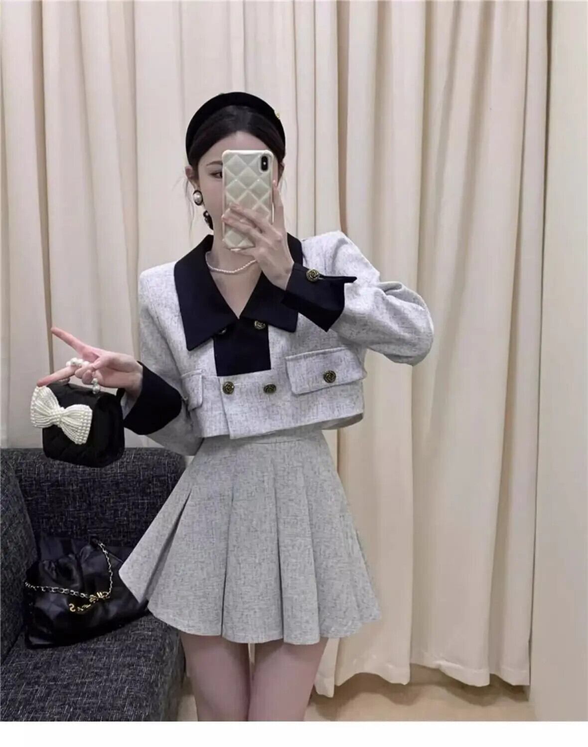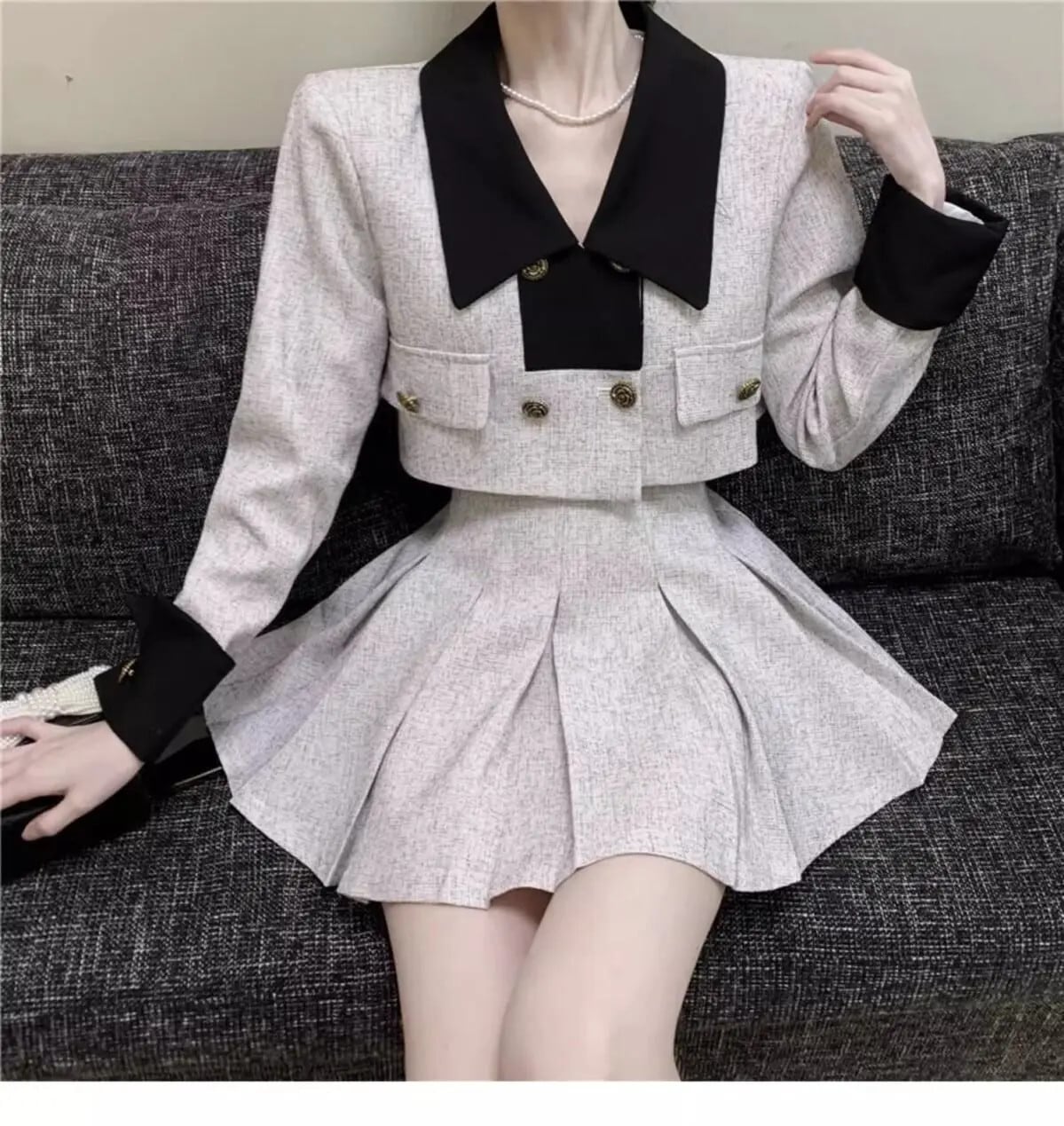 ショートグレーブレザーコート 2024 スーツスリムプリーツスカートケーキ怠惰 Hotsweet Y2k クロップトップ 2 点セットジャケット 大人ガーリー スウィート キュート カジュアル