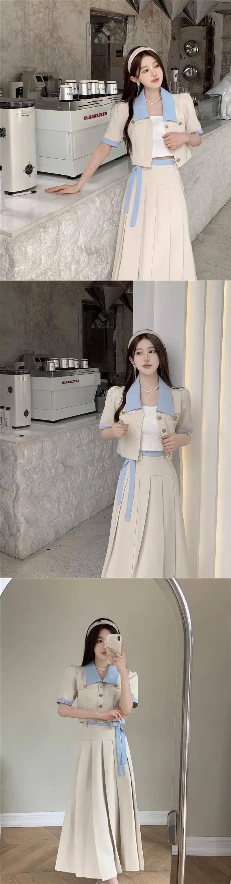 黒半袖ジャケットサマーブラウス 2 点セットレディース衣装 A ラインスカートセットクロップシャツ Faldas Y2k ショート ブラック ハーフスリーブ 夏物 Aライン