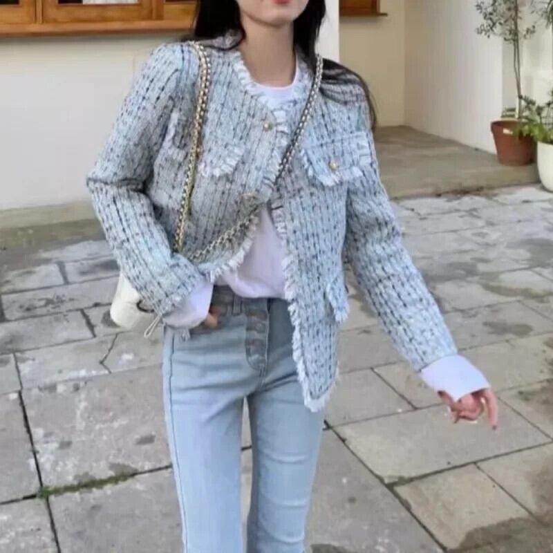チェック柄ラウンドネックシングルブレストショートアウタートップ 2024 フレンチスタイル気質香りツイードテルコート Oネック