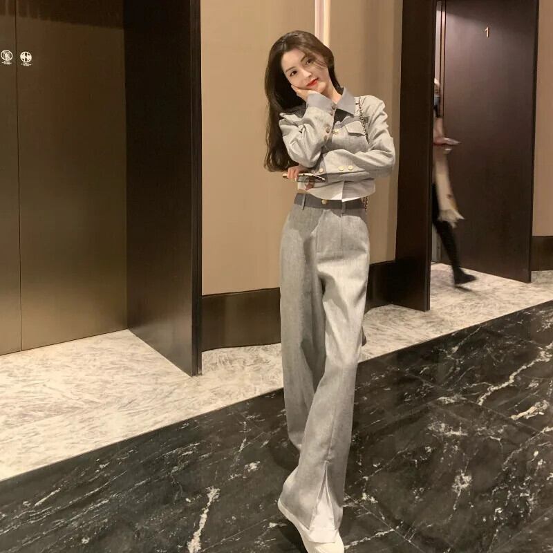 ラペルショートツイードコートトップワイドレッグパンツパンタロンデトラックスーツツーピースセットY2kジャケット ワイドパンツ