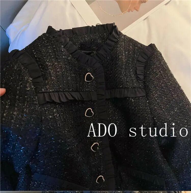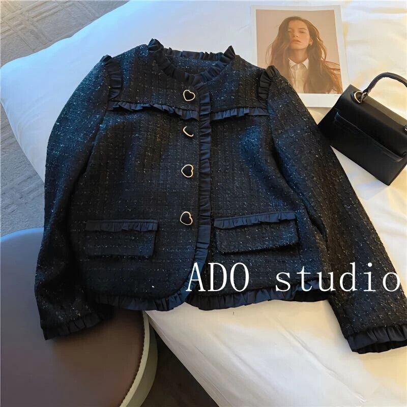 ラブボタン小さ香りコート 2024 春黒ツイードジャケット厚いフレンチスタイルトップショートチャケータ ブラック スプリング 春物