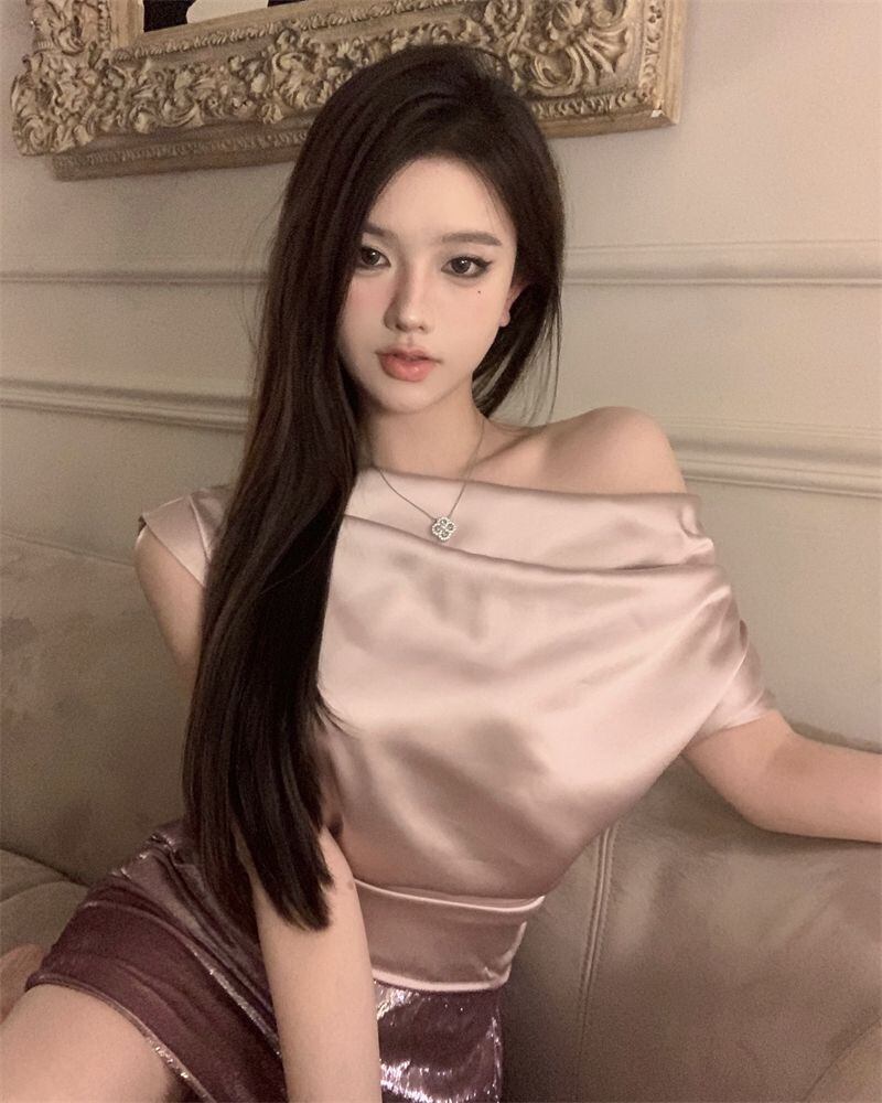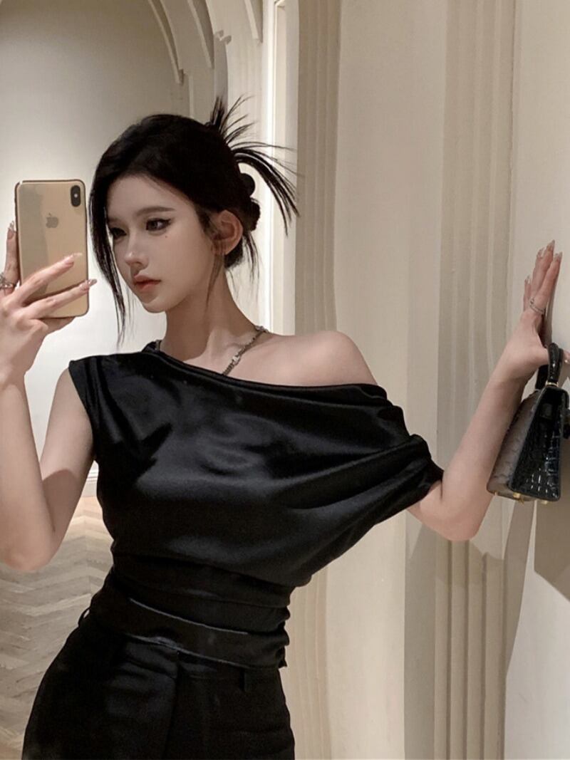 クロップサテン斜め襟半袖シャツイレギュラートップデサマーブラウスピンクシャツ ショート ハーフスリーブ 夏物