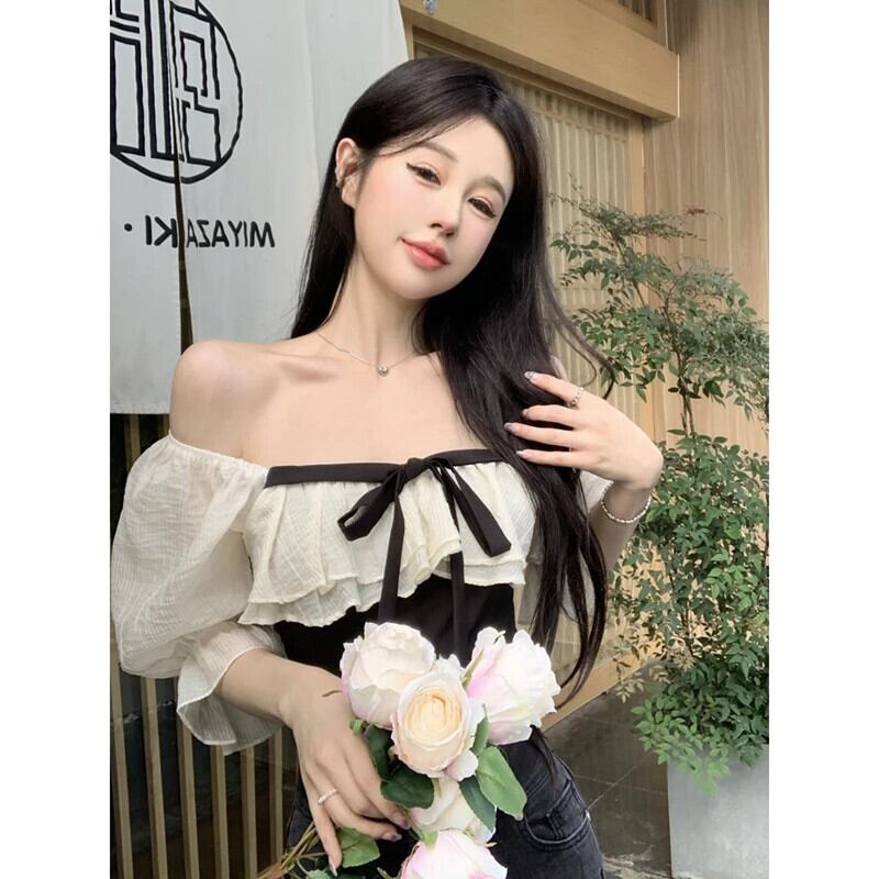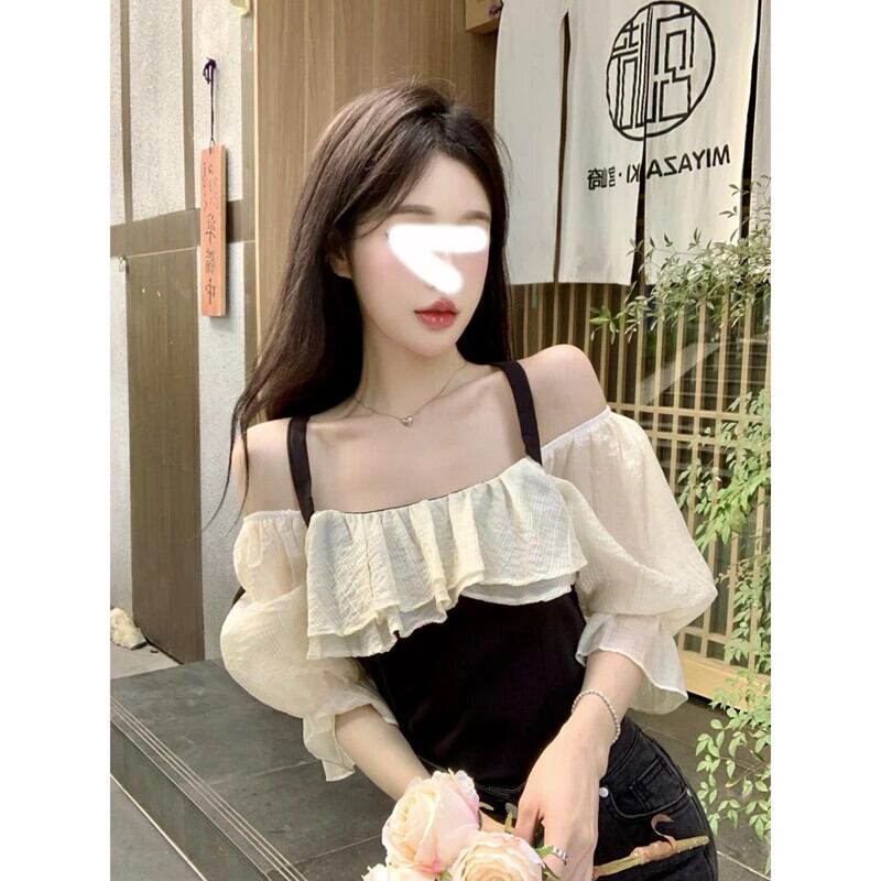 クロップド ブラウス フリル シック スイート フレンチ スタイル 半袖 美的 ホルター 暑い夏レジャー パッチワーク シャツ ラッフル 大人ガーリー スウィート キュート カジュアル サマー 夏物
