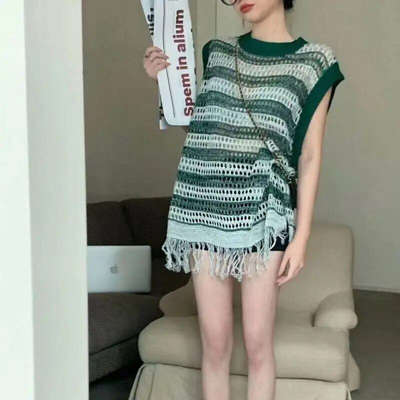 夏ノースリーブニットベスト O ネックストライプアウト Tel Chaleco ルーズオールマッチロングベスト サマー 夏物 Oネック