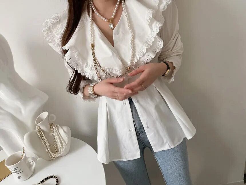 気質二重層レースラペルブラウスプリーツウエストデモーダ 2024 ヴェラーノ白菌シャツトップ ホワイト レッド