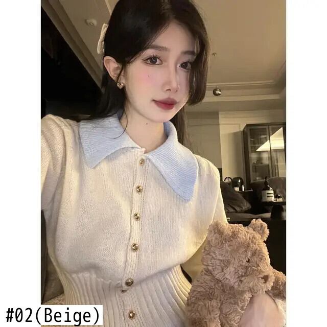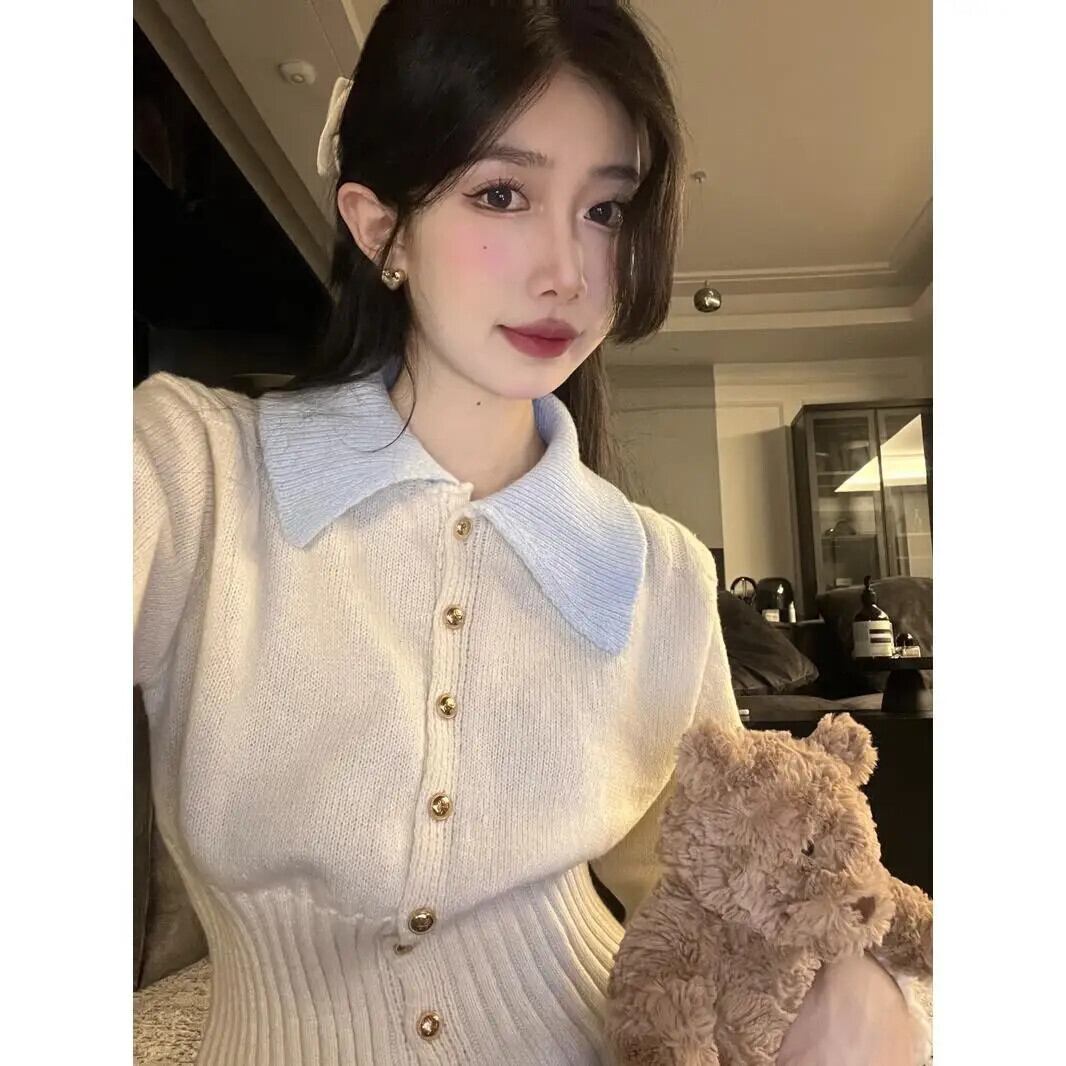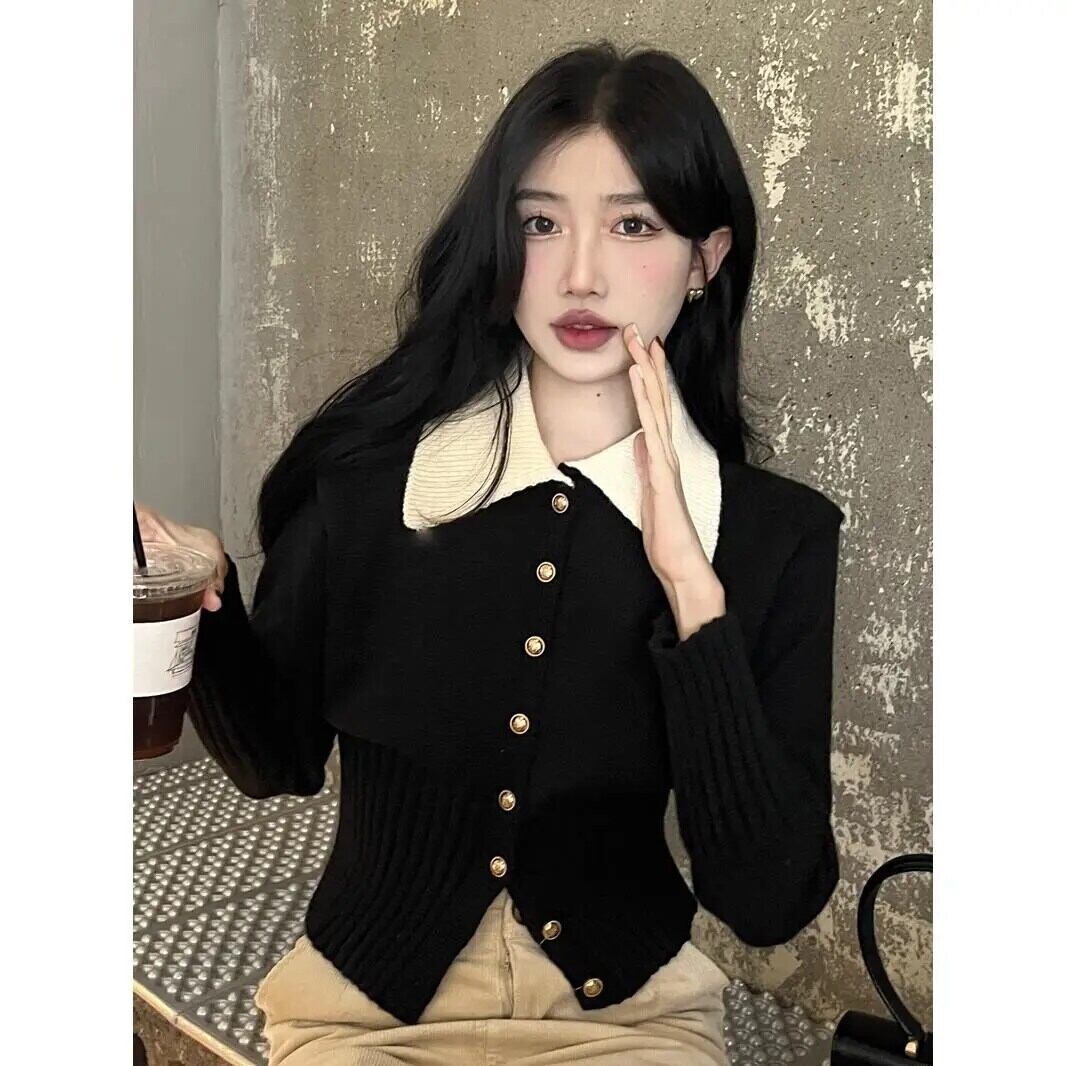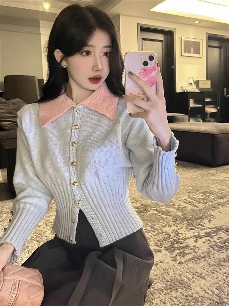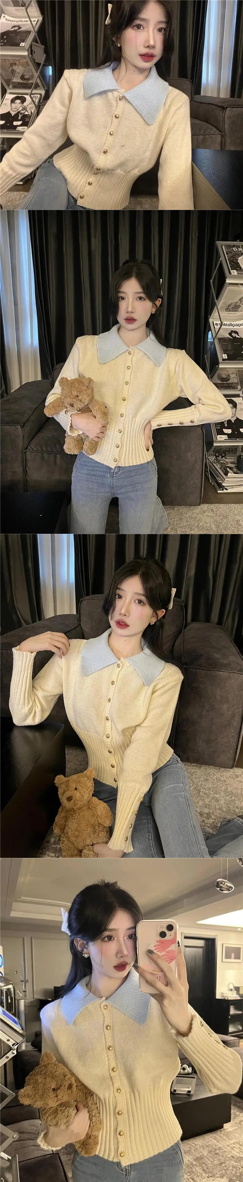 コントラストカラーラペルニットカーディガンショート優しいシングルブレスト長袖トップセーターデクロップドセーター ロング