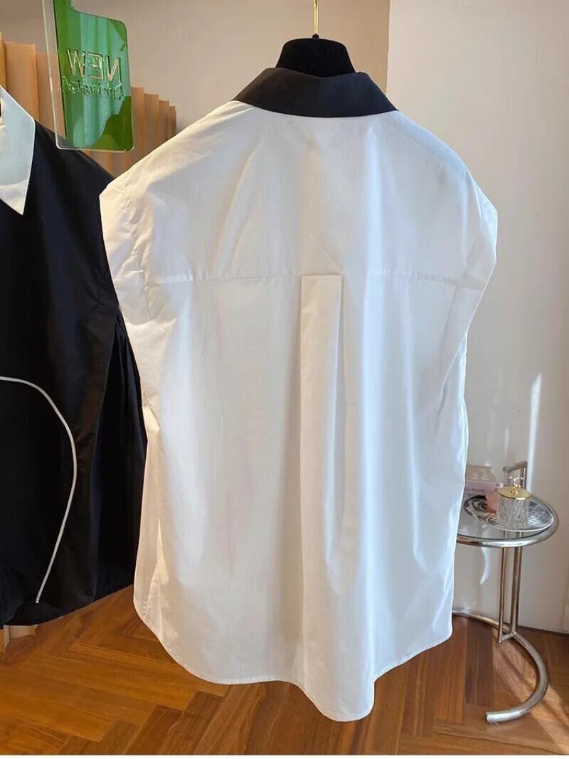 気質ノースリーブシャツ 2024 夏ブラックホワイトトップデモーダ人形ブラウスラペルセクシーシャツ サマー 夏物