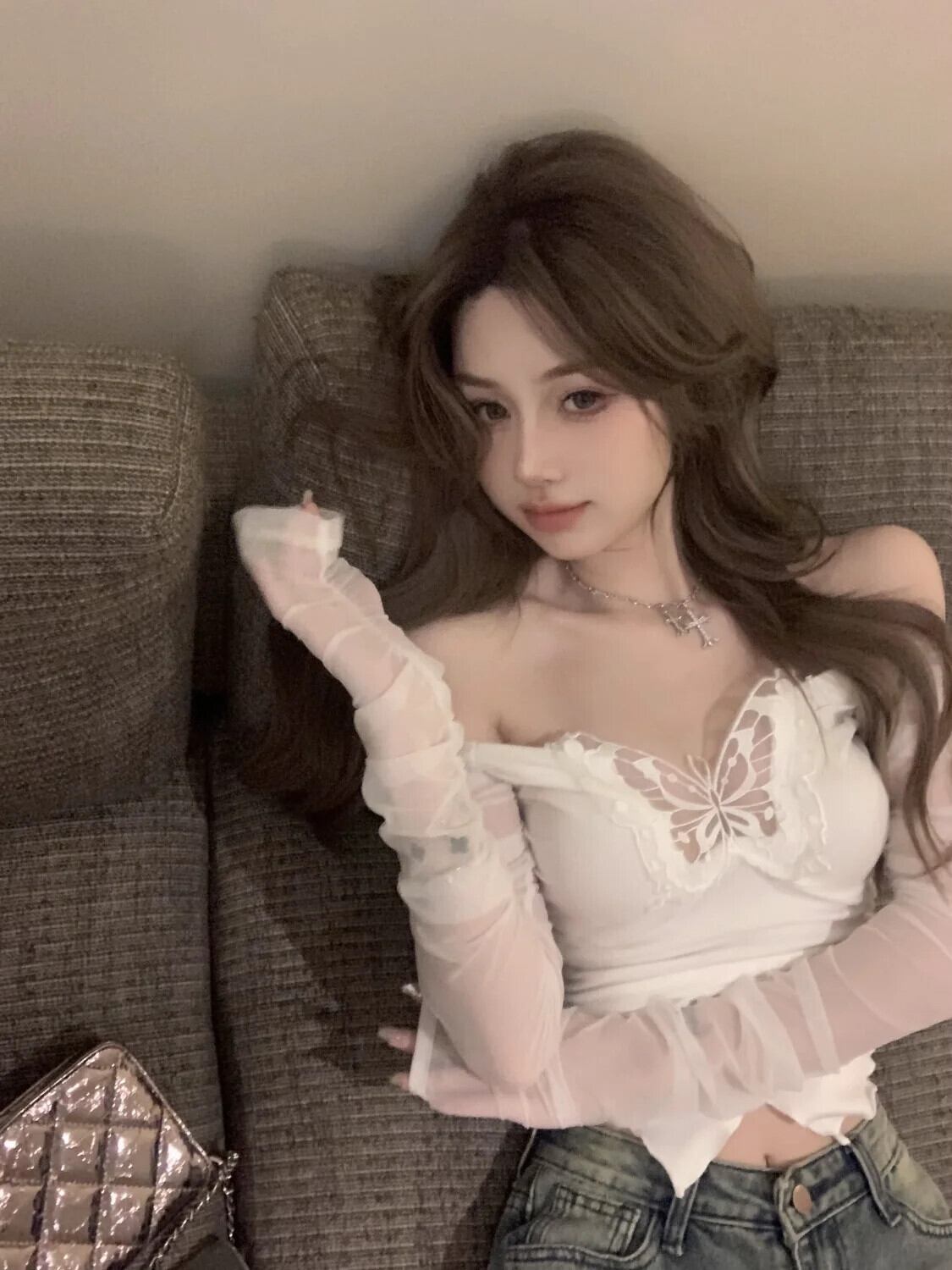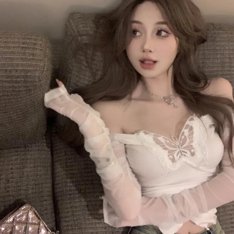 スタイルオフショルダー Tシャツ美的蝶クロップドメッシュトップスセクシー黒、白 Y2k Kpop 長袖 Tシャツトップス ロング ホワイト ブラック