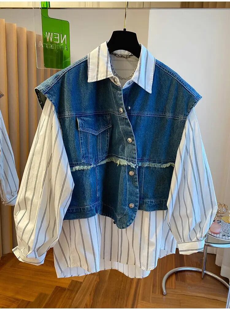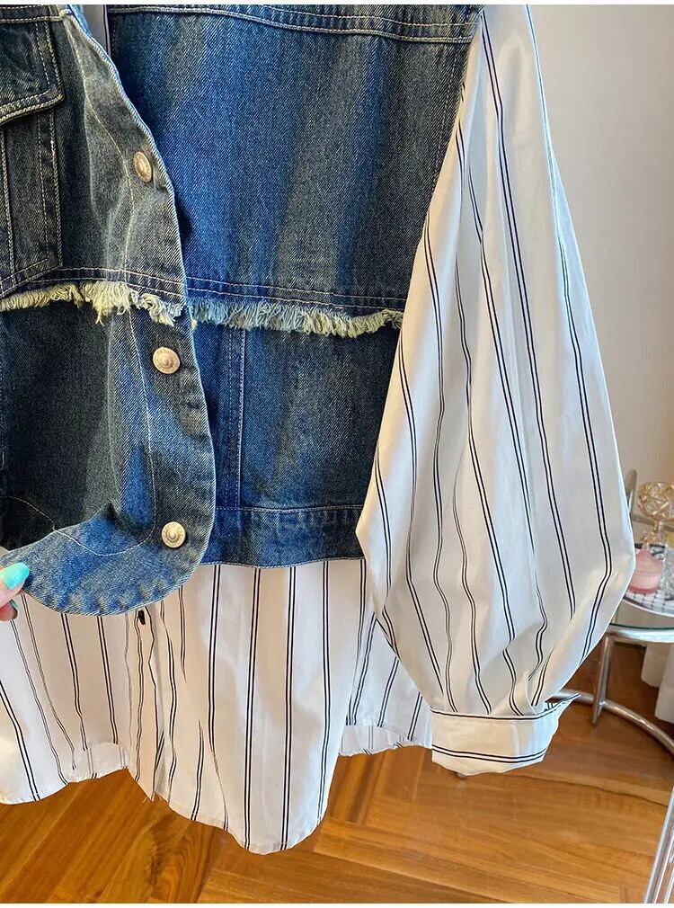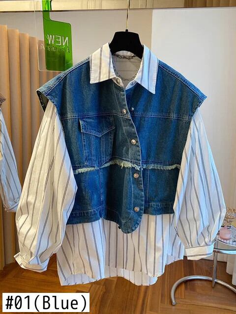 Y2k Chaleco ルーススプライシングデニムコート偽ツーピースストライプシャツ秋ベストジャケットトップ オータム 秋物