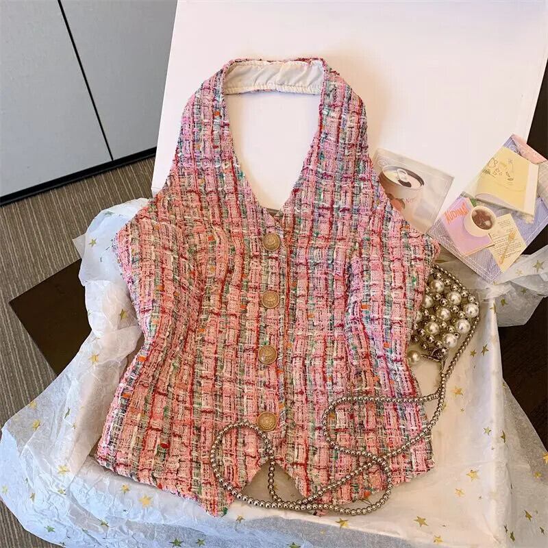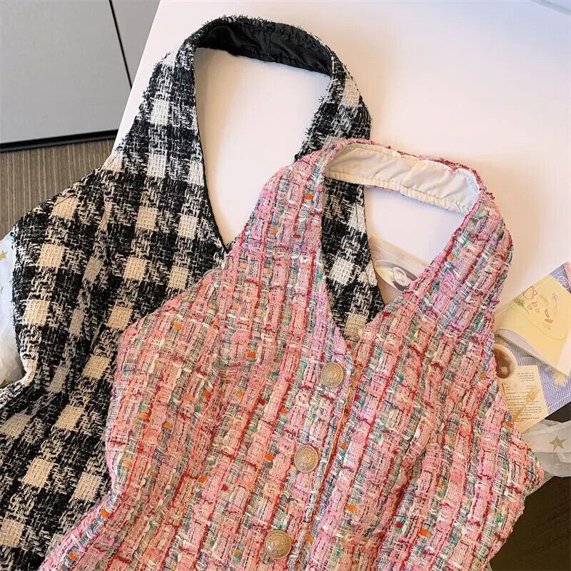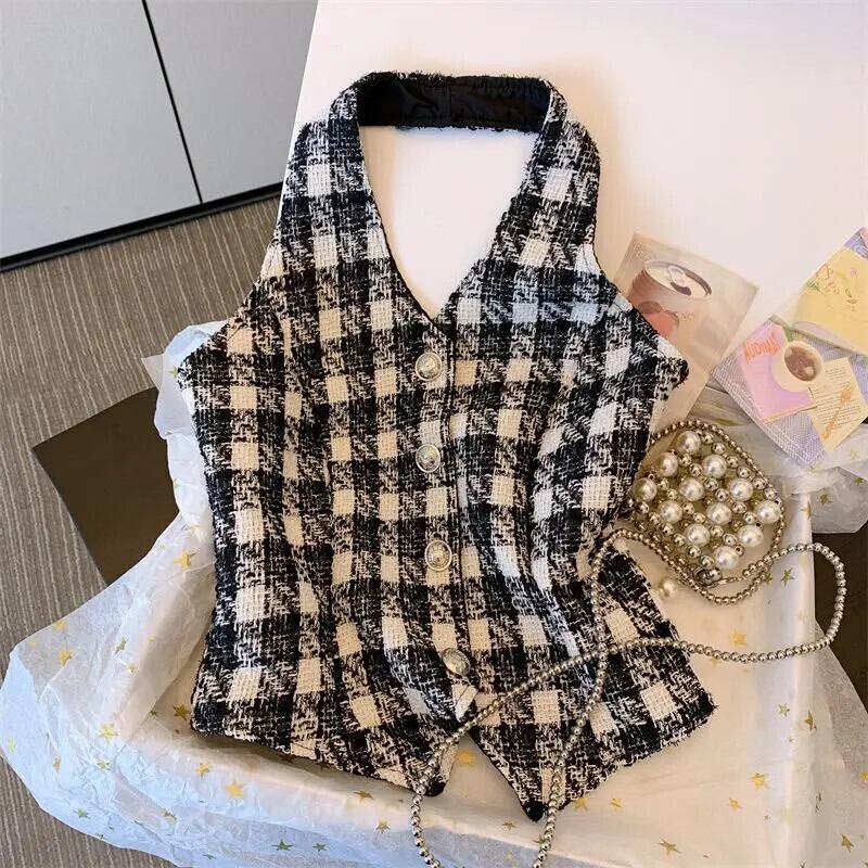 バックレス Chalecos パラブラックピンク V ネックホルターニットキャミソールベストショートツイードジャケット Y2k キャミソールチェック柄タンク 2024 チュニック Vネック