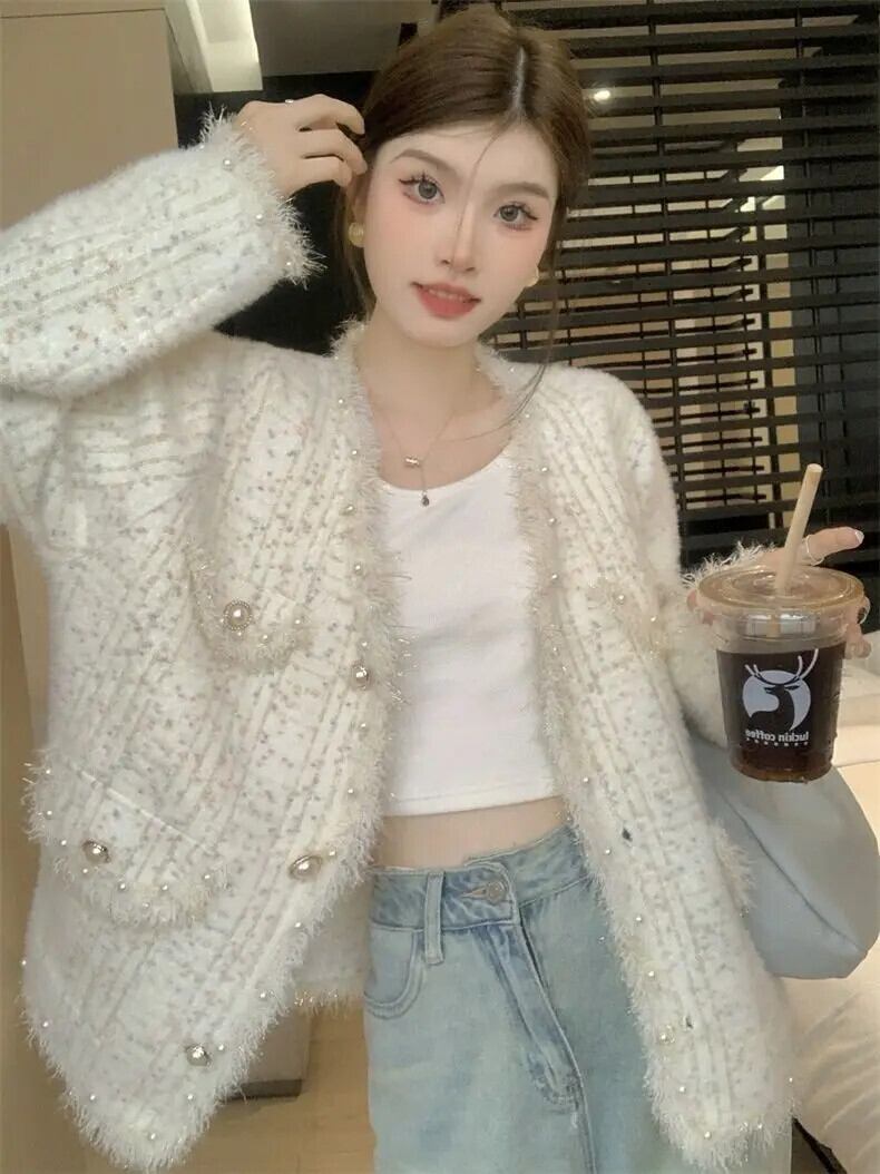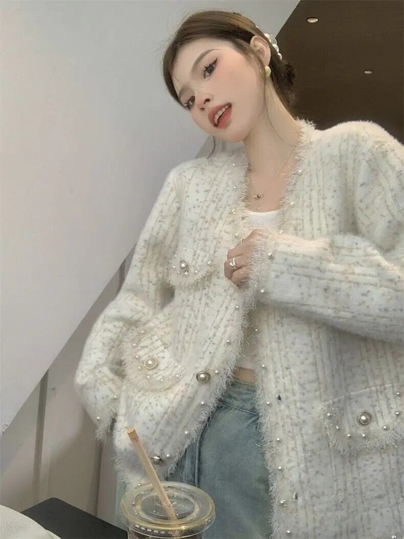 気質電話スタッズセーターパールボタンニットカーディガンチャケータ V ネックジャケットトップコート Vネック 真珠