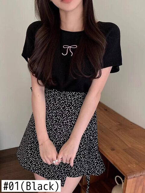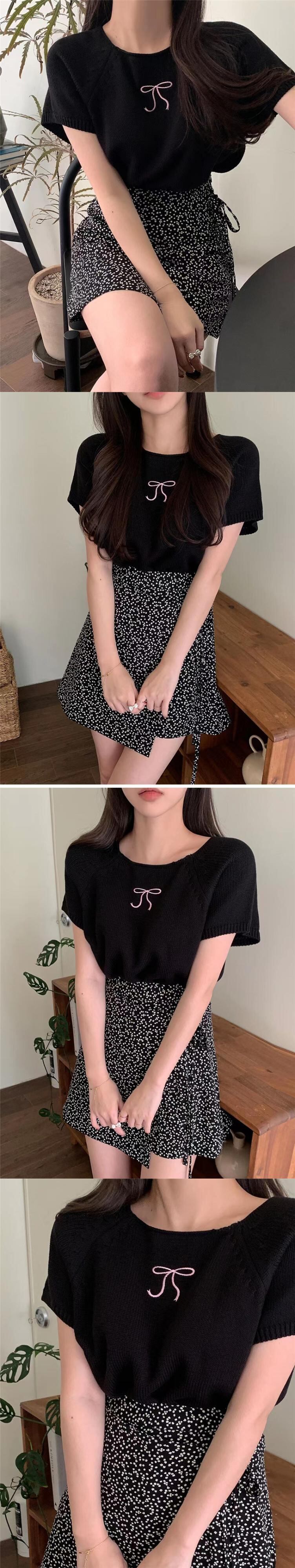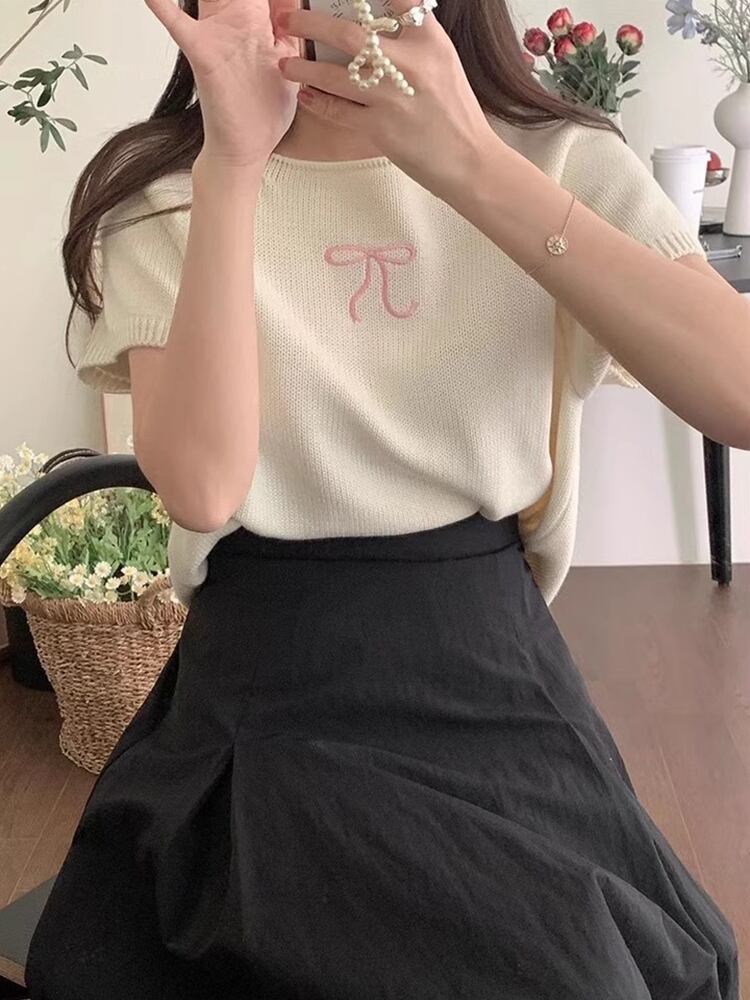 グランジグラフィックTシャツ気質ラウンドネックリボンプリントコントラストカラー半袖ニットトップセーターセーター ショート ハーフスリーブ Oネック