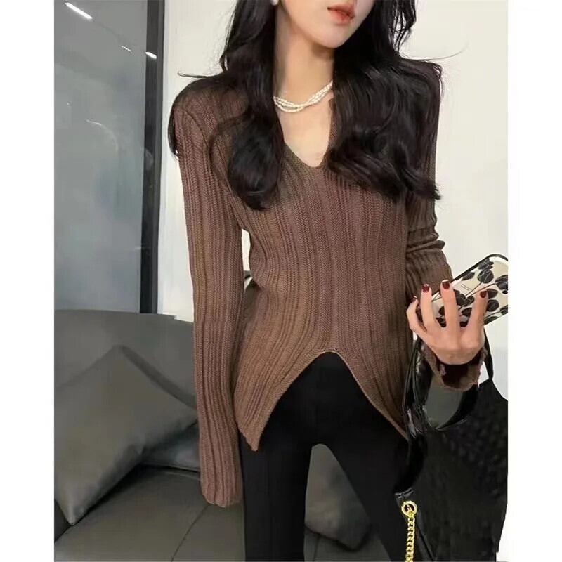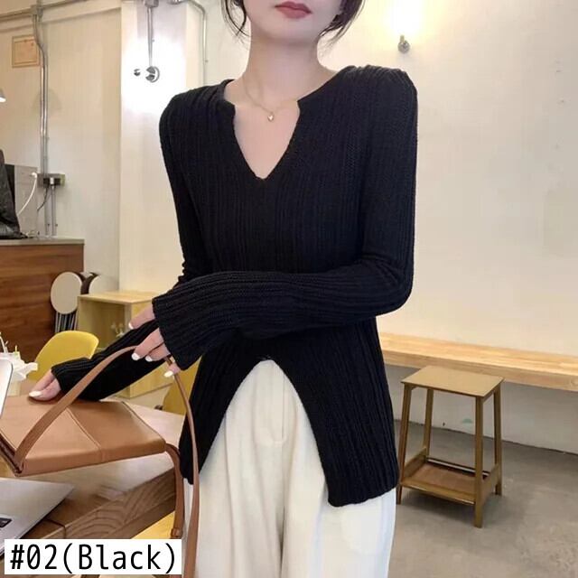 シャツ 2024 セータージャンパープルオーバーセータースプリット長袖 V ネックニットトップ黒 Y2k 薄型 ロング ブラック Vネック