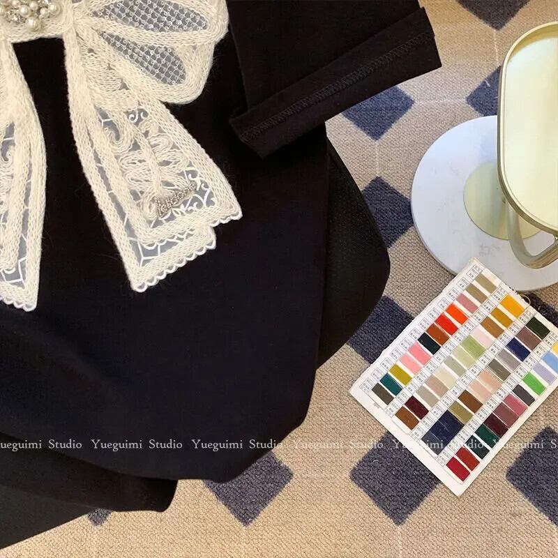 Tシャツ黒弓甘い Tシャツ春夏トップスルーズ Ropa デ半袖レトロ Camisetas ショート ブラック リボン ハーフスリーブ 大人ガーリー スウィート キュート カジュアル スプリング 春物 サマー 夏物