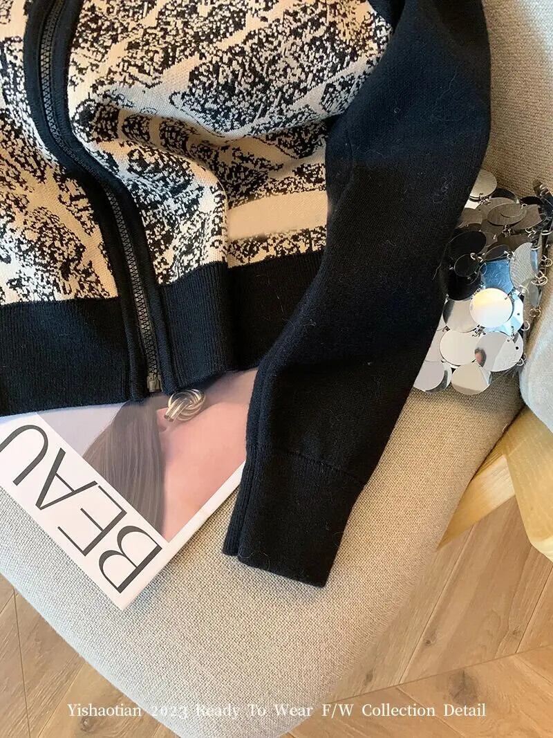 ヘビー刺繍ジャカードジッパーセーター秋ルーズスタンドカラーニットカーディガンショートコートトップ オータム 秋物