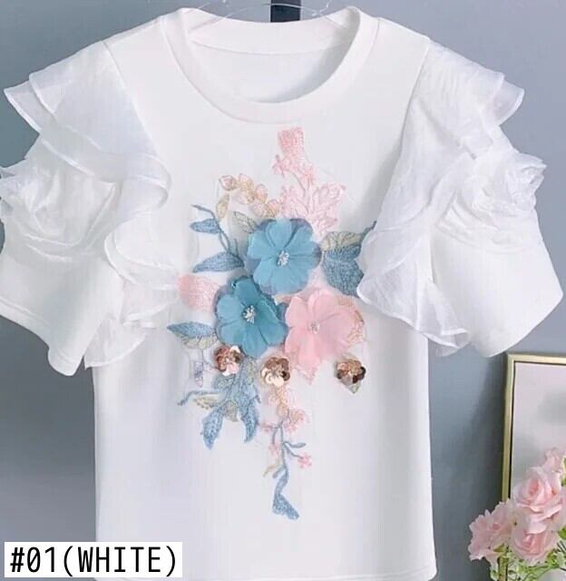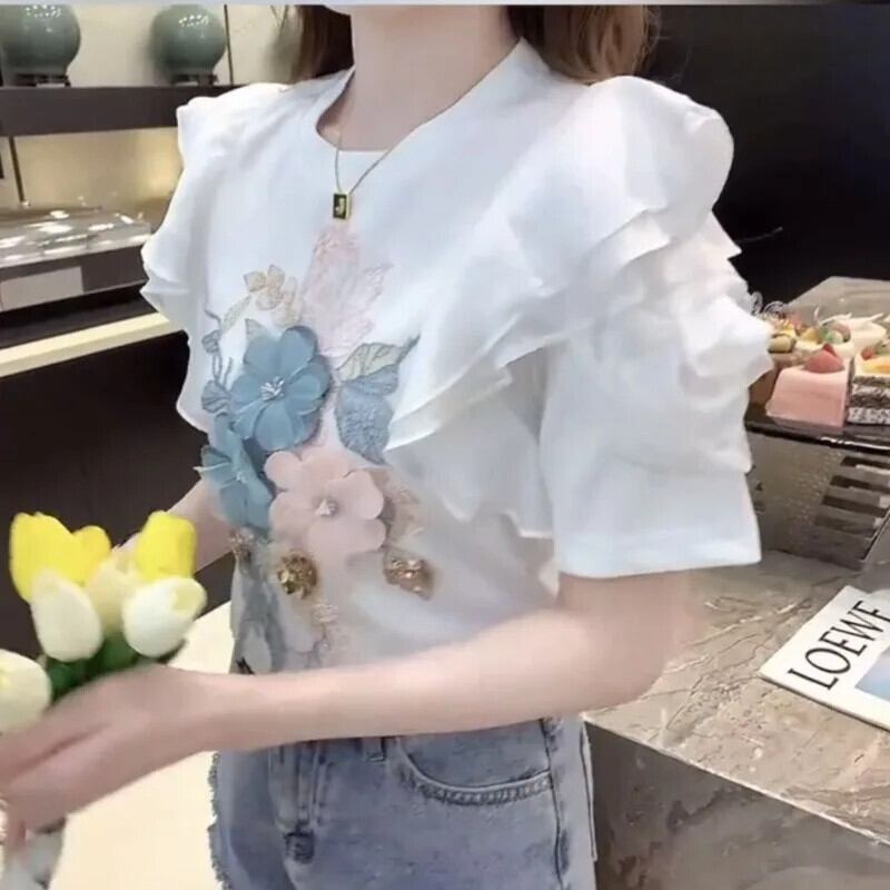 刺繍 Tシャツ花フリル Y2k トップグラフィック Tシャツ Ropa デ夏白 Tシャツ Kpop グランジ ホワイト レッド サマー 夏物 花柄