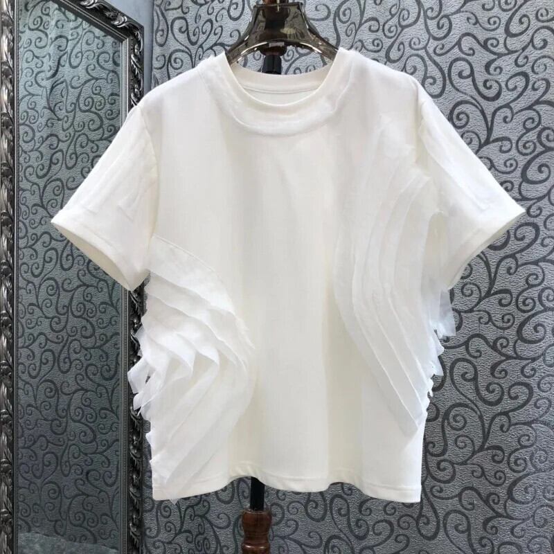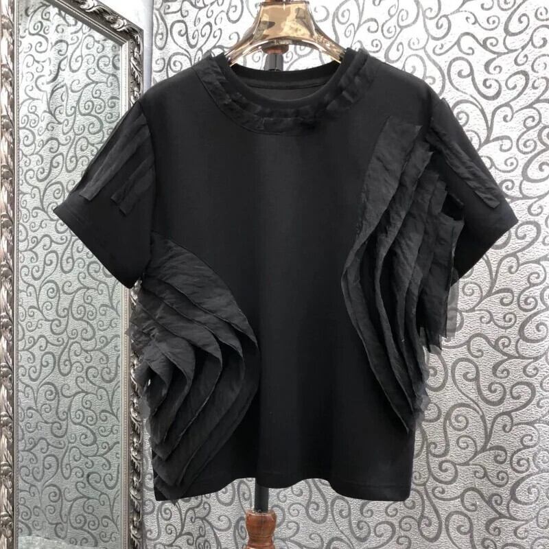 フリルラウンドネック半袖コットン Tシャツ Y2k トップ黒、白、グレー Tシャツグランジ Ropa デ特大 ショート ホワイト ブラック ハーフスリーブ Oネック