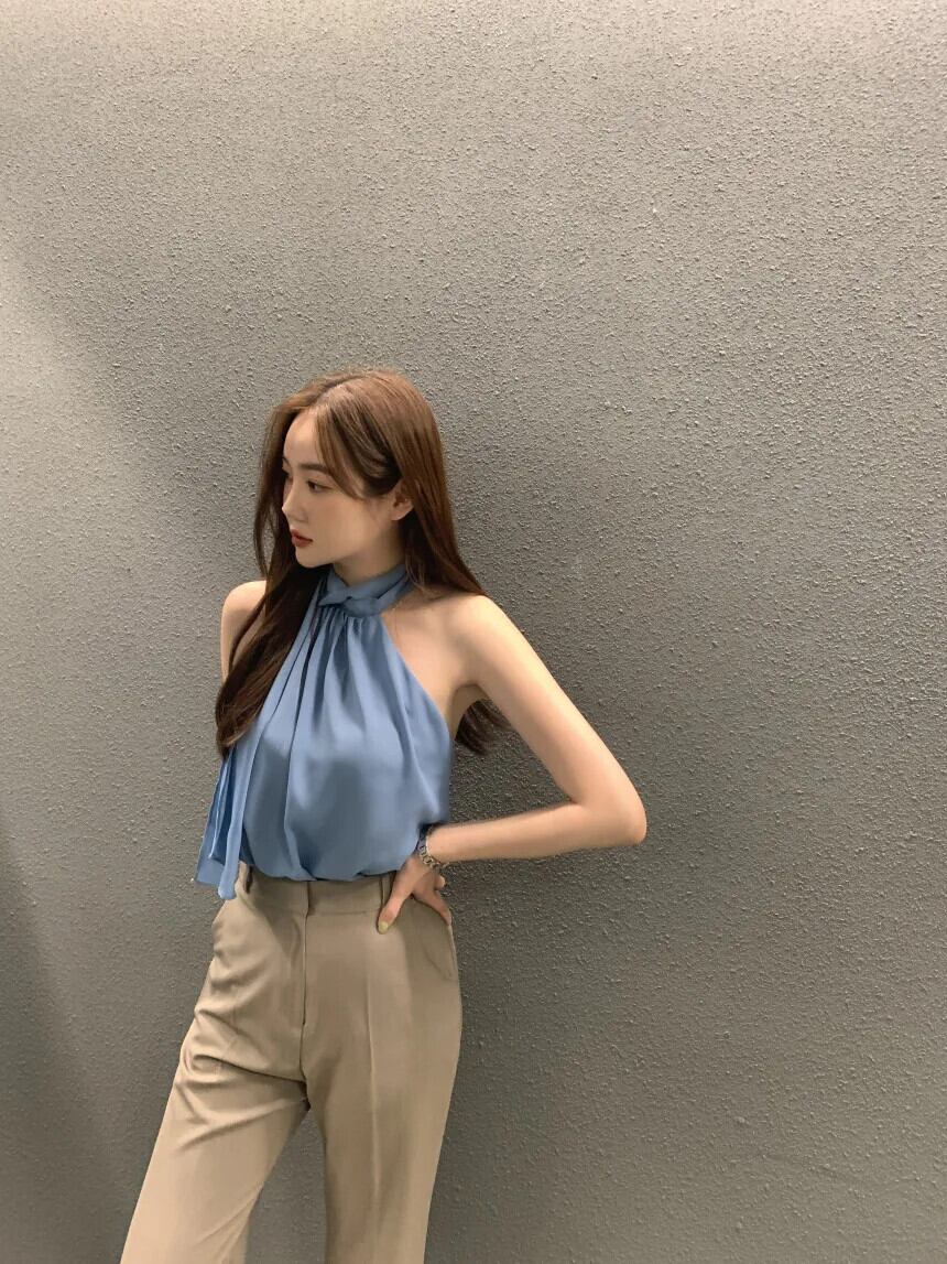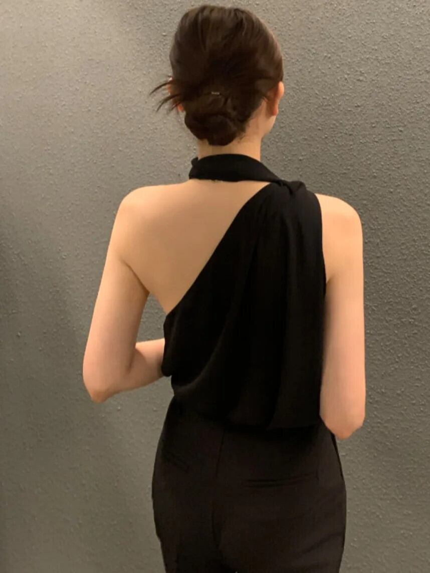 ストラップカラーぶら下げネックセクシー背中開いたサテンタンクトップ黒キャミソールブラウスサマーシャツ ブラック 夏物