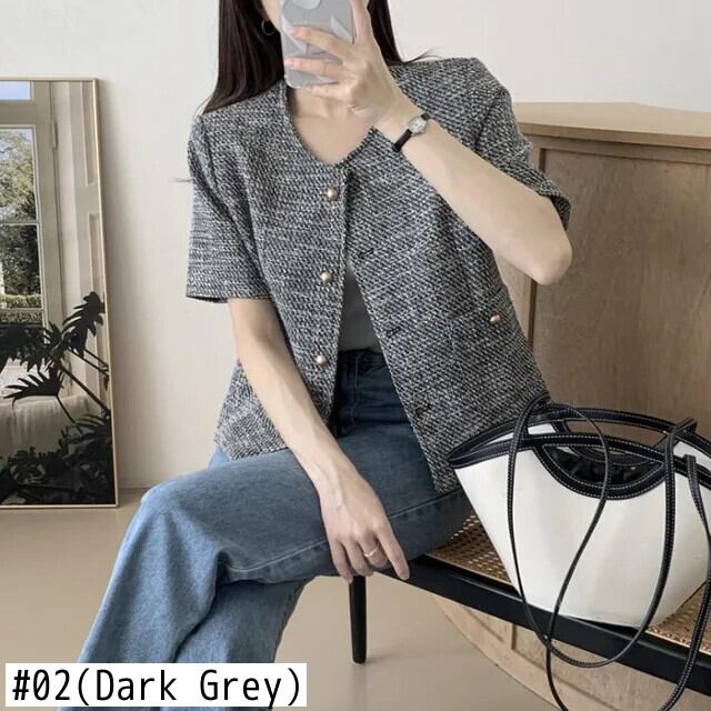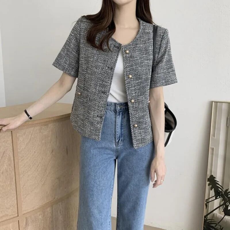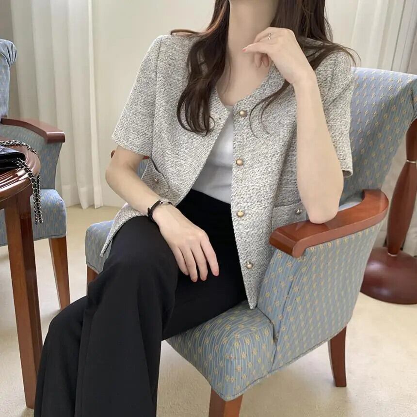 クロップドショルダー気質グレー半袖ジャケット Chaquetas パラサマーブレザースーツコート ショート ハーフスリーブ 夏物