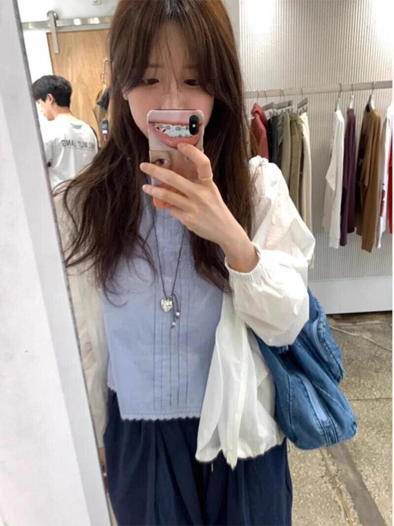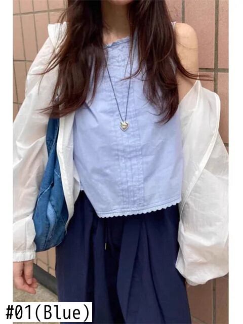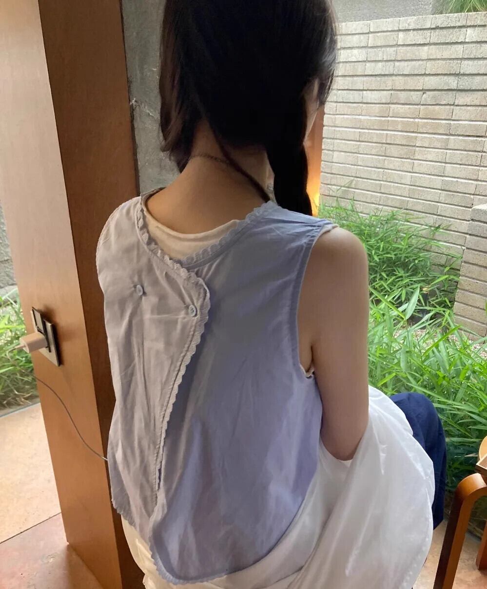 ブルーレースラウンドネックボタンバックノースリーブベストシャツ es 夏クロップトップタンク 2024 ブラウスシャツ サマー 夏物 Oネック