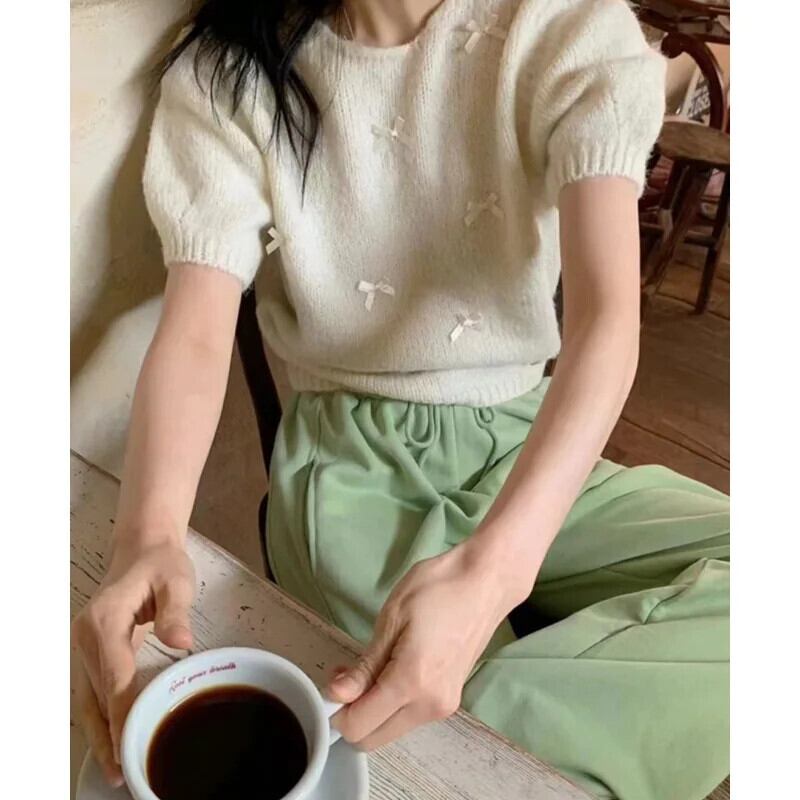 春夏甘いソフトバブルトップボウ半袖ラウンドネックニットセーターピンクセーター ショート リボン ハーフスリーブ 大人ガーリー スウィート キュート カジュアル スプリング 春物 サマー 夏物 Oネック