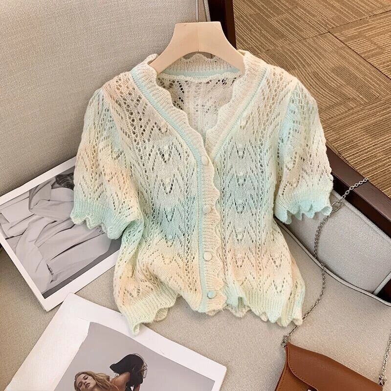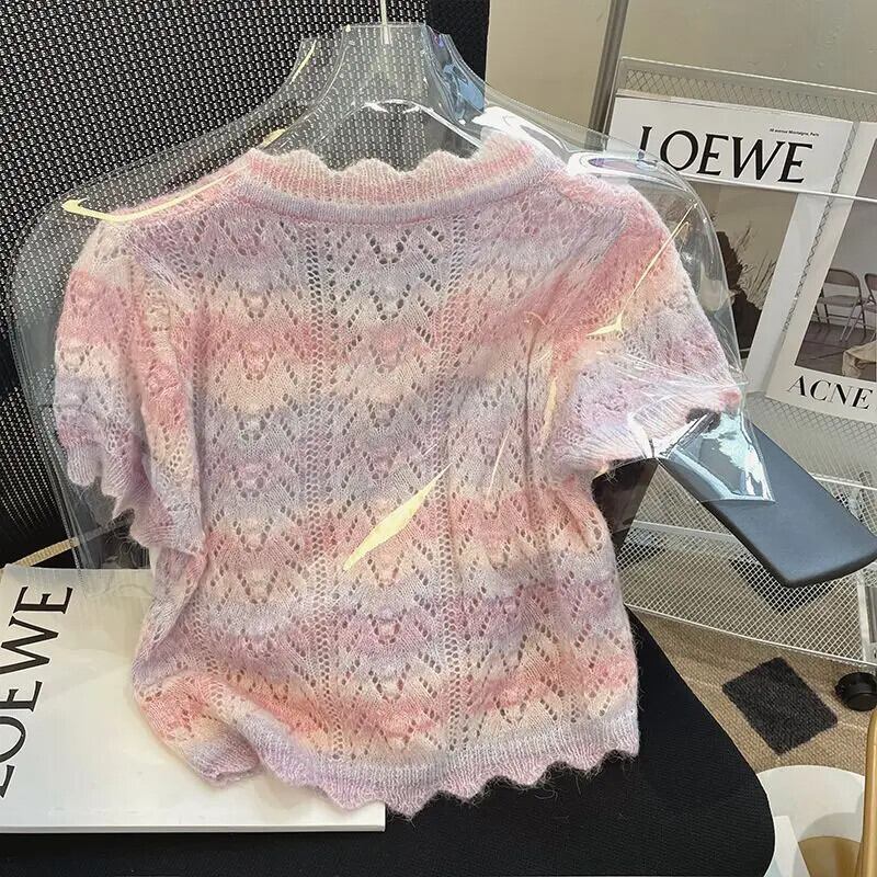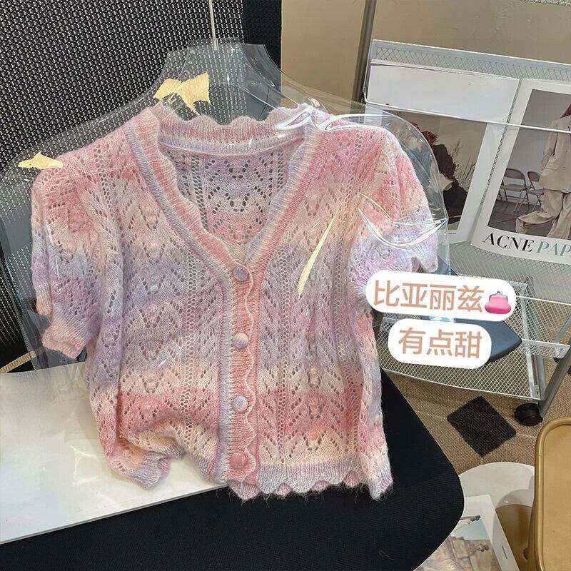 アウト V ネック半袖カーディガン作物ニット Tシャツ夏セーターストライプトップス 2024 ショート ハーフスリーブ サマー 夏物 Vネック