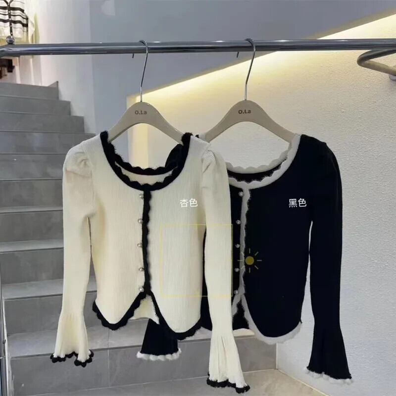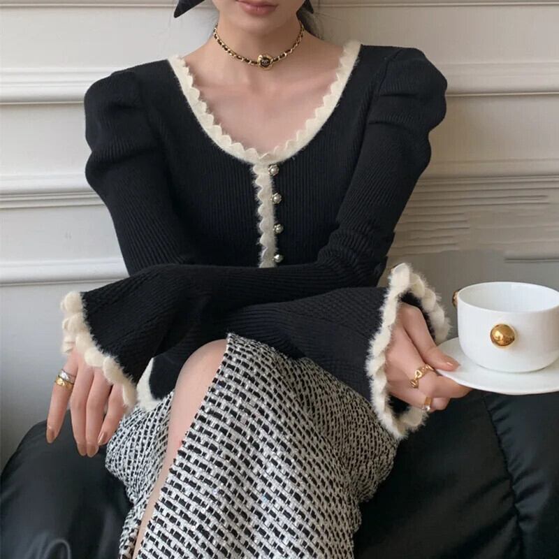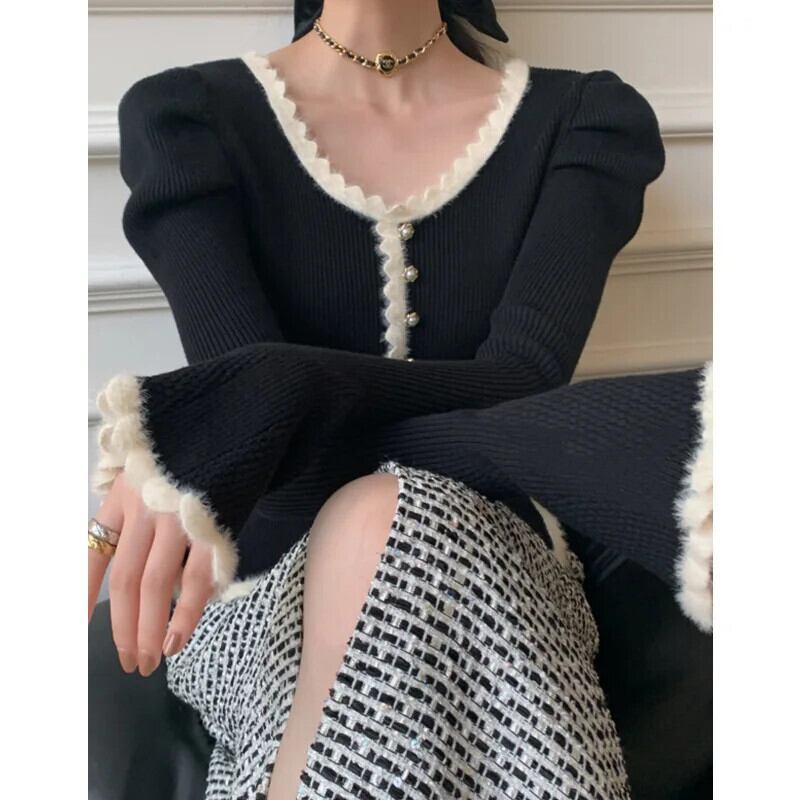 V ネッククロップトップスリムジャンパーセーター Y2k 春夏不規則ニットセーター黒 2024 ブラック スプリング 春物 サマー 夏物
