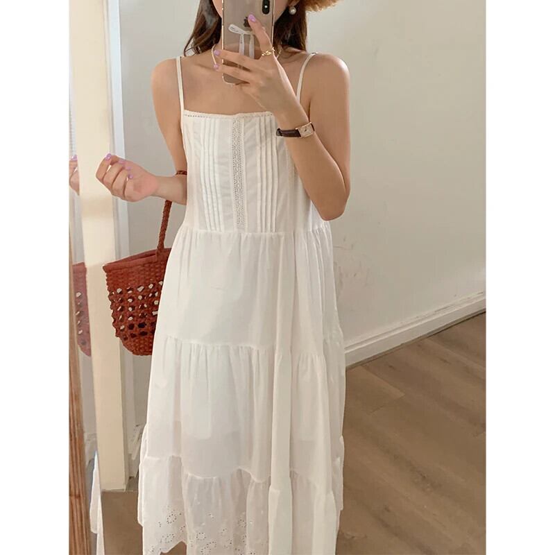 ローブ気質レースパッチワークアウトルーズホワイトサスペンダードレス 2024 夏マキシプリーツセクシー Vestidos デ サマー 夏物