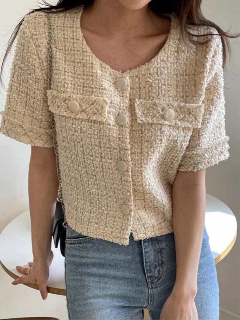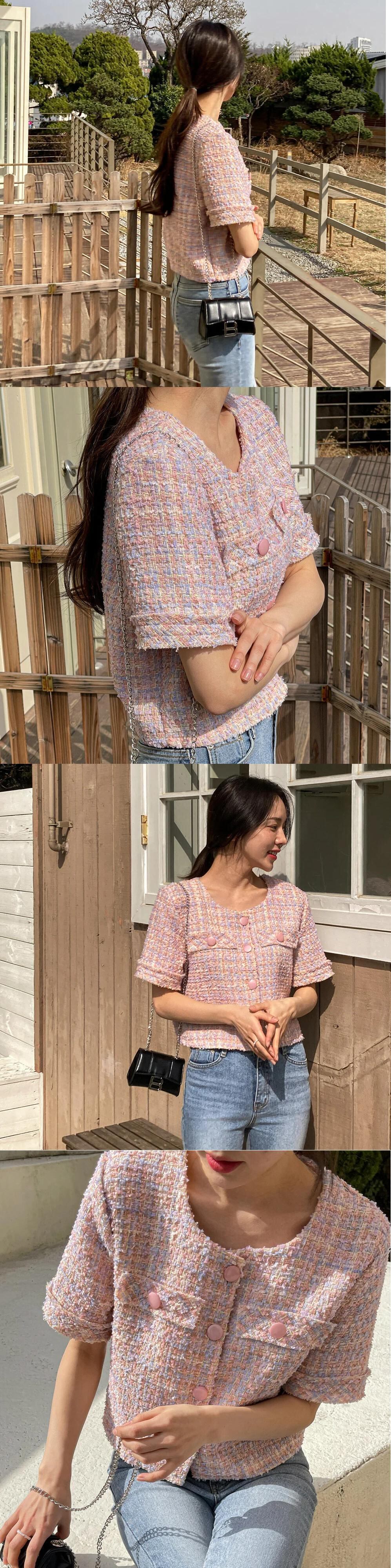 気質ツイードトップシングルブレストラウンドネックジャケット半袖コートピンククロップチャケータスパラチェック柄 ショート ハーフスリーブ Oネック