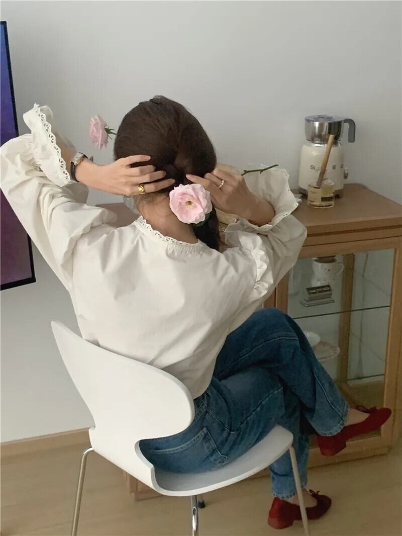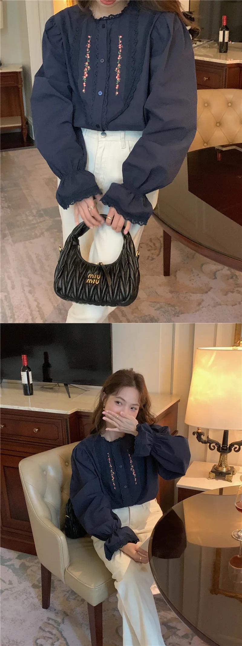 ラウンドネックパッチワークレースルーズフレアスリーブシャツ刺繍フラワートップ2024ブラウス レッド Oネック フラワーデザイン