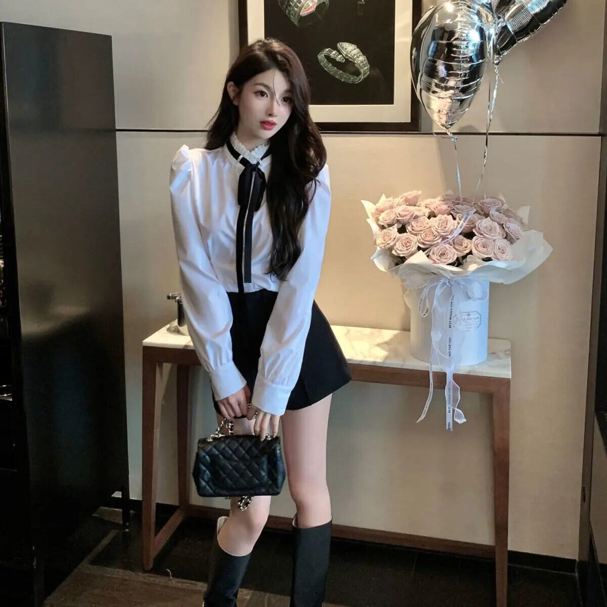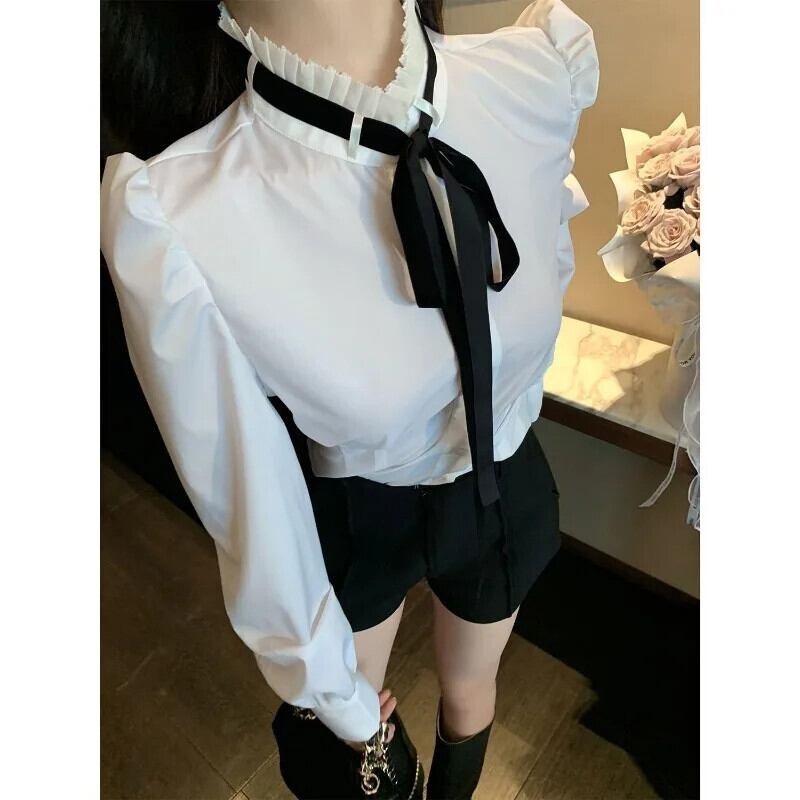 白シャツロリータスタイル JK 学生純粋春オフィスレディスリム作物ホットスウィートトレンディ長袖シックブラウス ロング ホワイト 大人ガーリー キュート カジュアル スプリング 春物 ピュア 会社 学校 通勤や通学にも