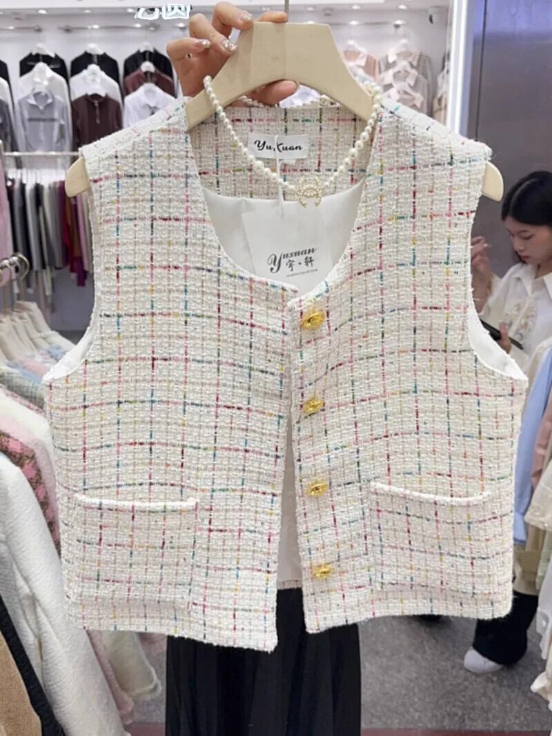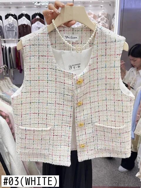 作物ジャケットチョッキショートコートピンクツイードラウンドネックシングルブレストダブルポケットノースリーブベストトップス Oネック