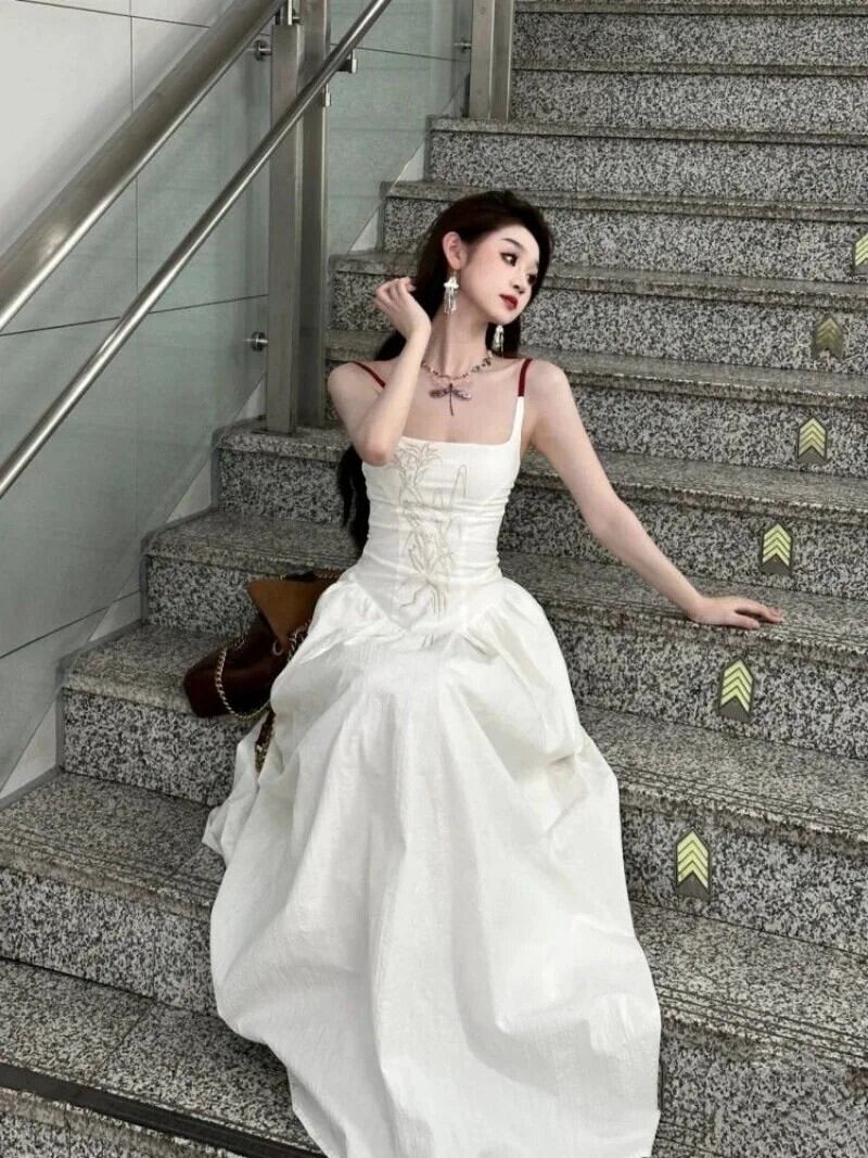刺繍スタイルロングオープンバックストラップホリデードレス Vestidos De es サスペンドスリングローブ Vestido 夏 レッド サマー 夏物