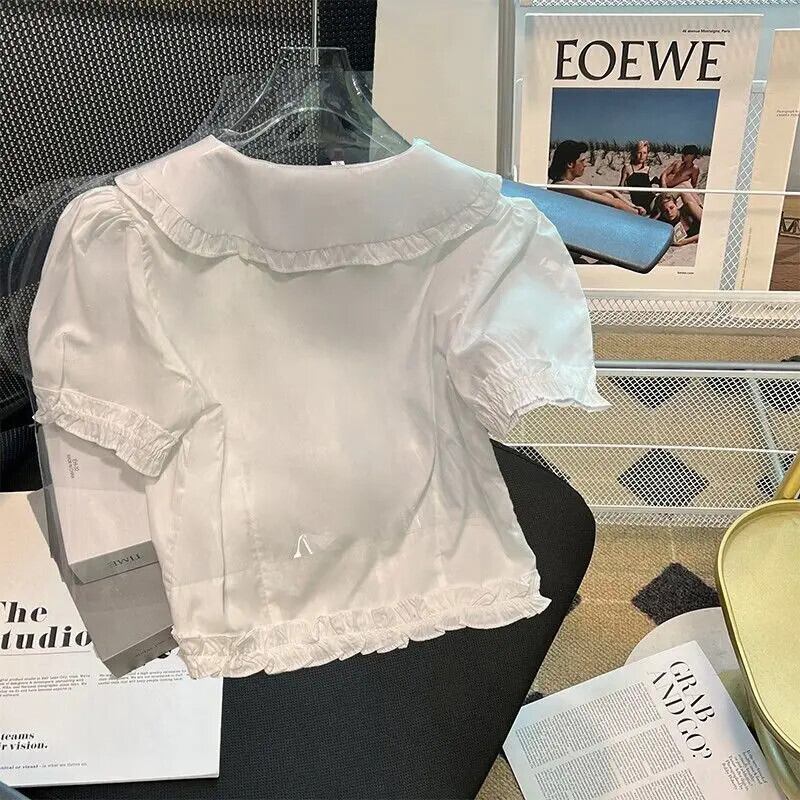 夏フレンチドールネック半袖菌シャツ白プリーツレースブラウス 2024 クロップトップ ショート ホワイト ハーフスリーブ サマー 夏物