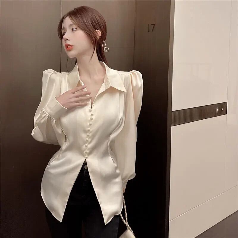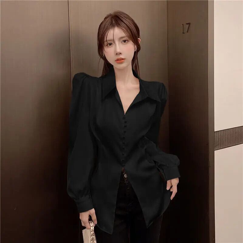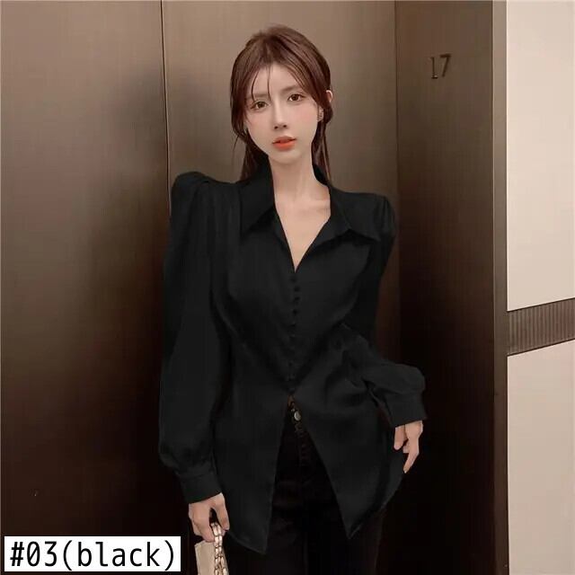 バックリボンパフスリーブシャツスリムオフィスレディブラウスターンダウンカラートップスホワイト 会社 学校 通勤や通学にも