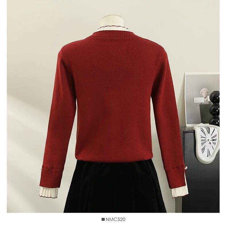 ジャンパー セーター デ ジャージ セーター スリーブ トップ 赤 プルオーバー ハーフカラー パッチワーク リボン トップス 冬 黒 ニット レッド ブラック ウィンター 冬物