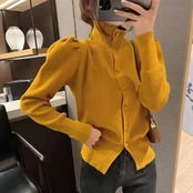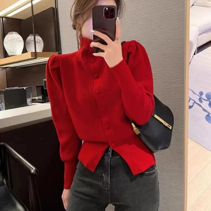ランタンスリーブセータートップスタートルネックシングルブレストチュニックセーターニットカーディガンコート