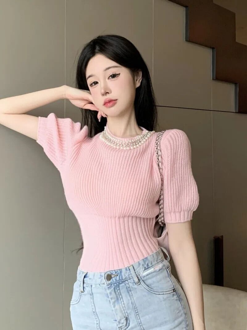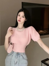 セーターショートバブルスリーブニットセーター秋ピンク甘いウエストスタイルプルオーバー Y2k グランジニットトップス 大人ガーリー スウィート キュート カジュアル オータム 秋物