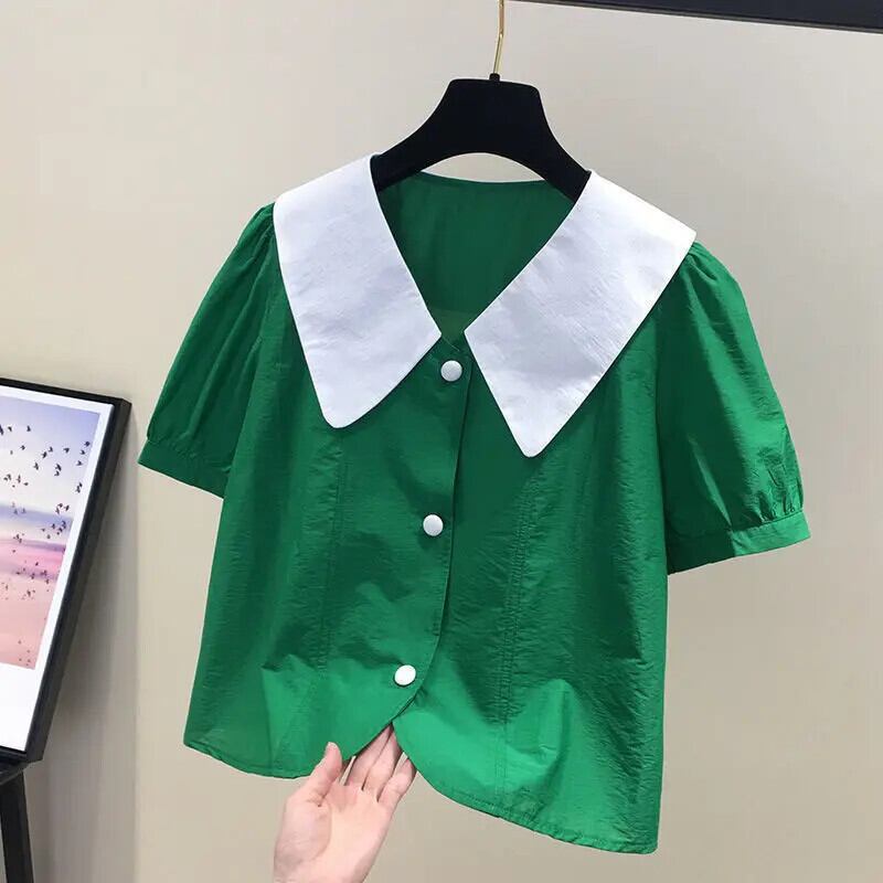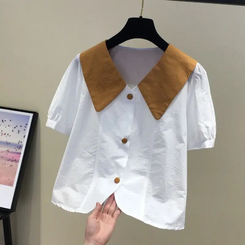 コントラストドールネック半袖シフォンシャツサマーブラウスデルーズトップ ショート ハーフスリーブ 夏物
