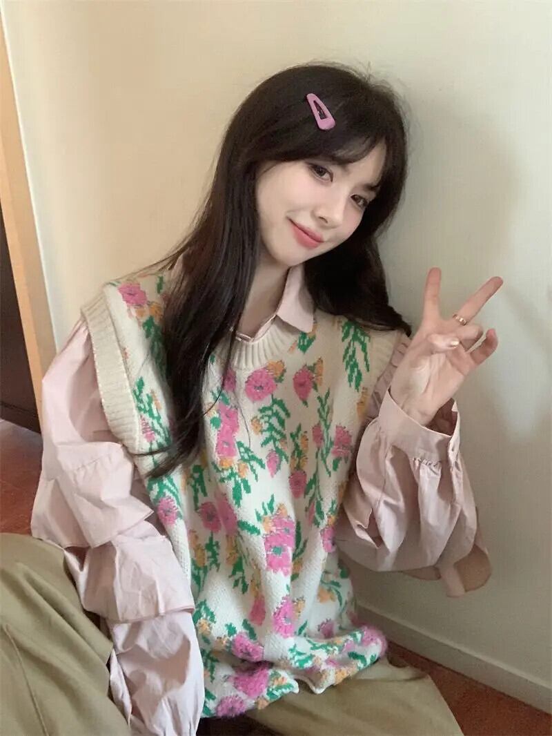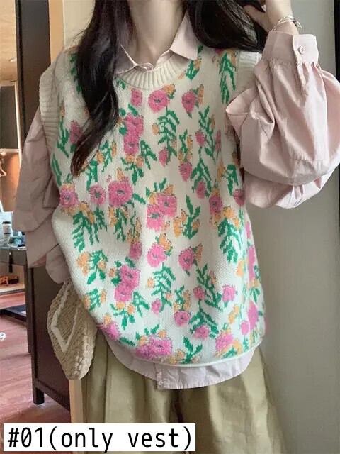 Chaleco ジャカードノースリーブニットセーターフラワーベストトップ Y2k 秋 オータム 秋物 フラワーデザイン