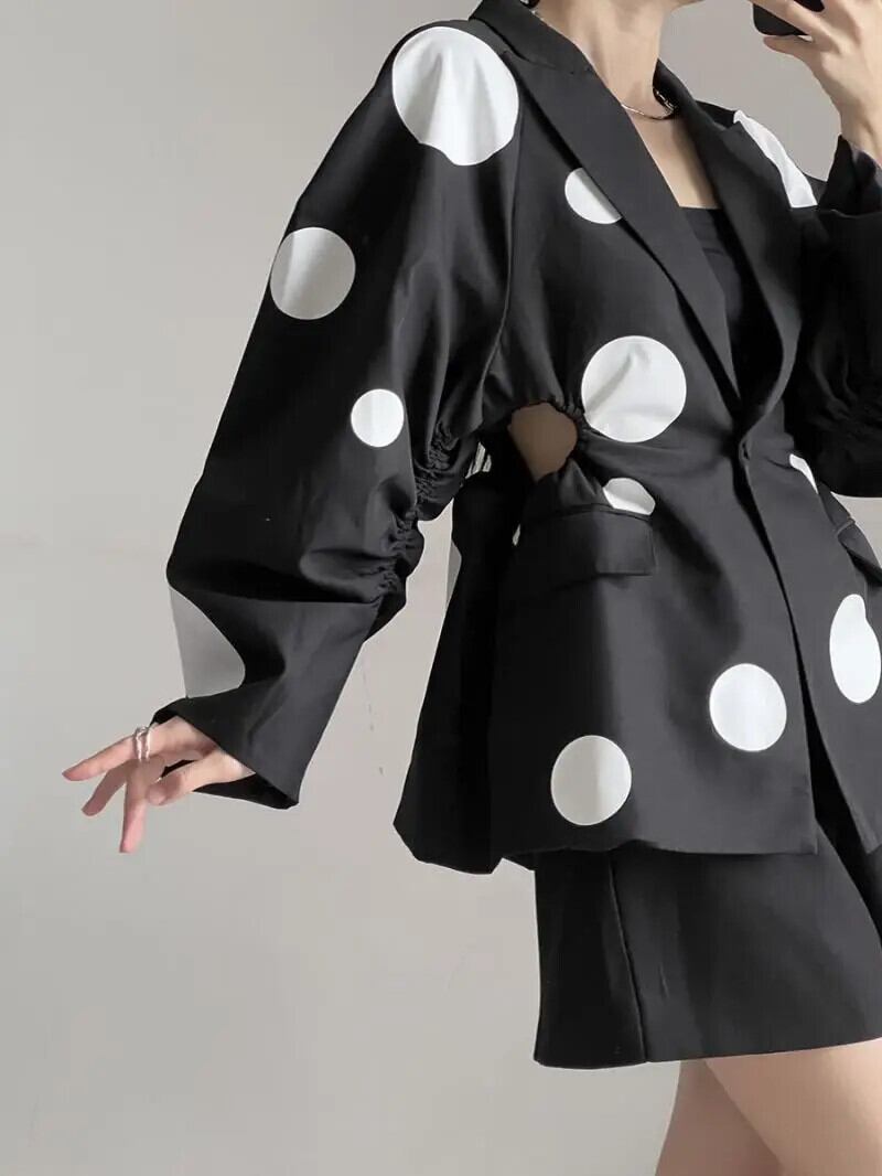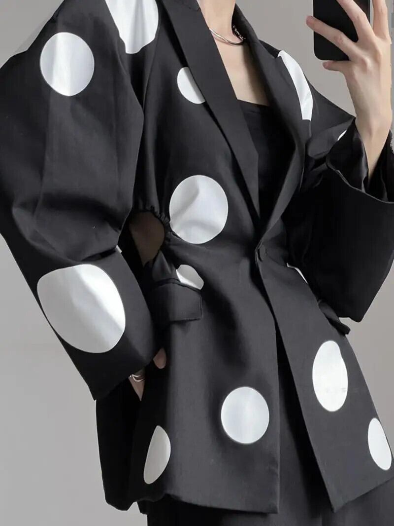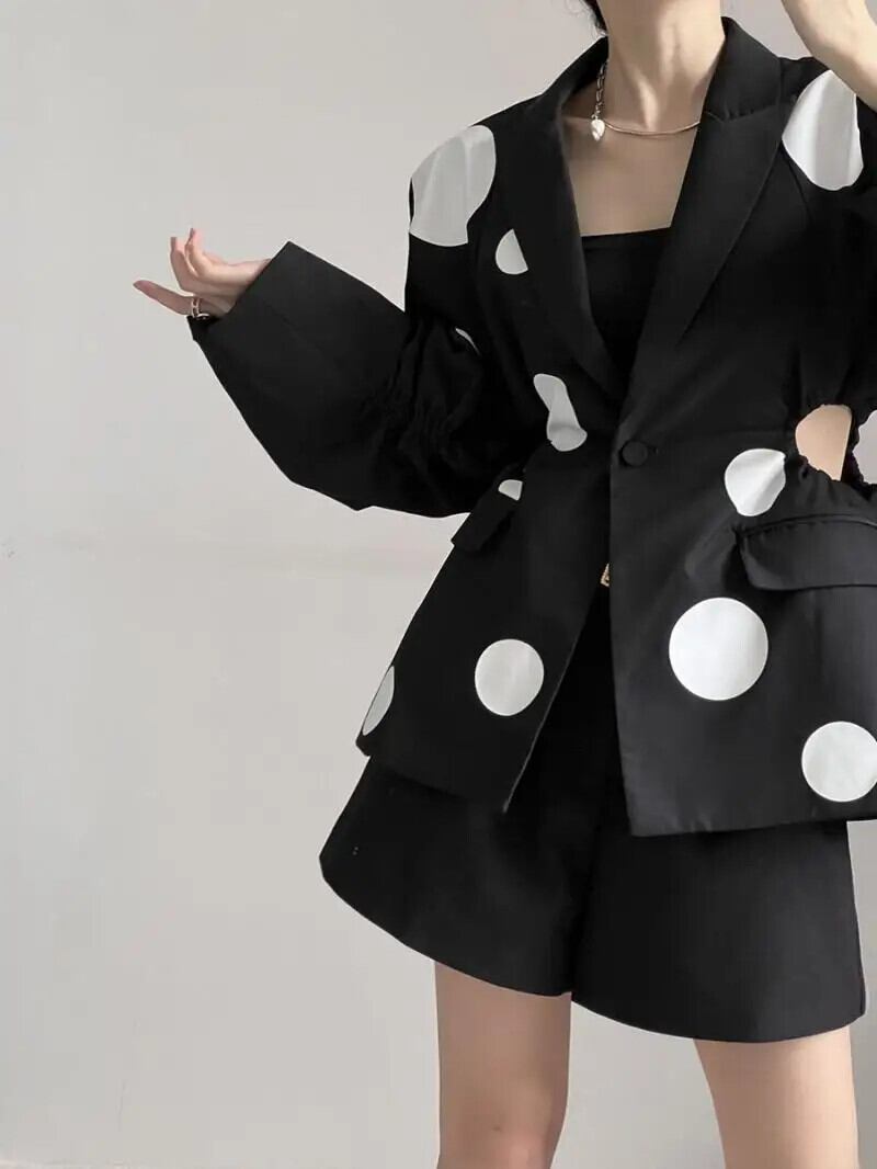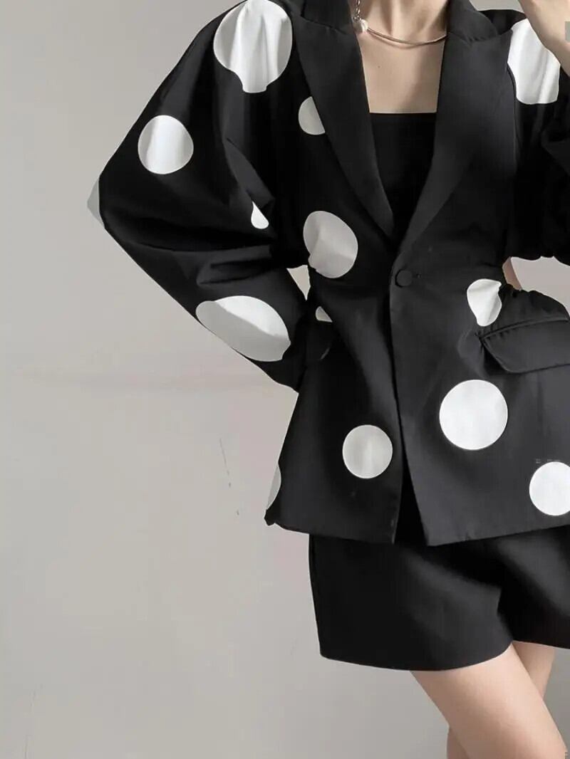 黒、白水玉ブレザーウエストジャケット Chaquetas パラ 2024 トップ原宿コート ホワイト ブラック かわいい