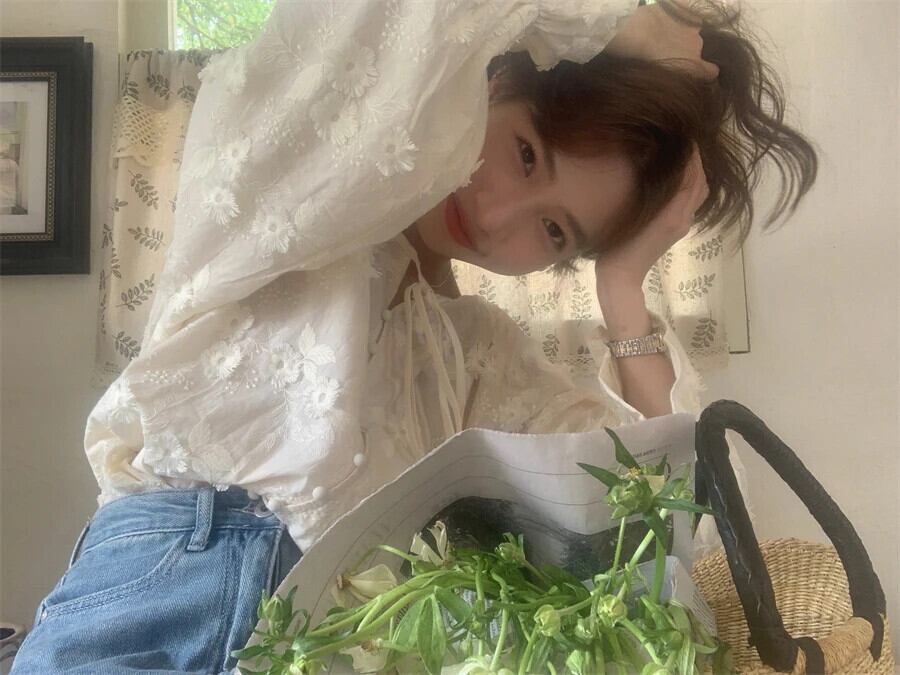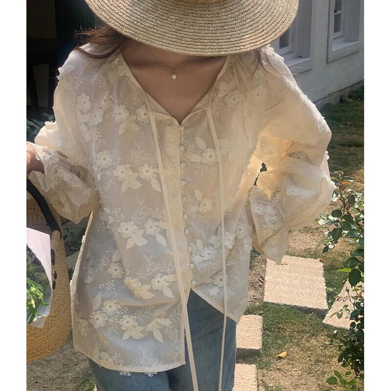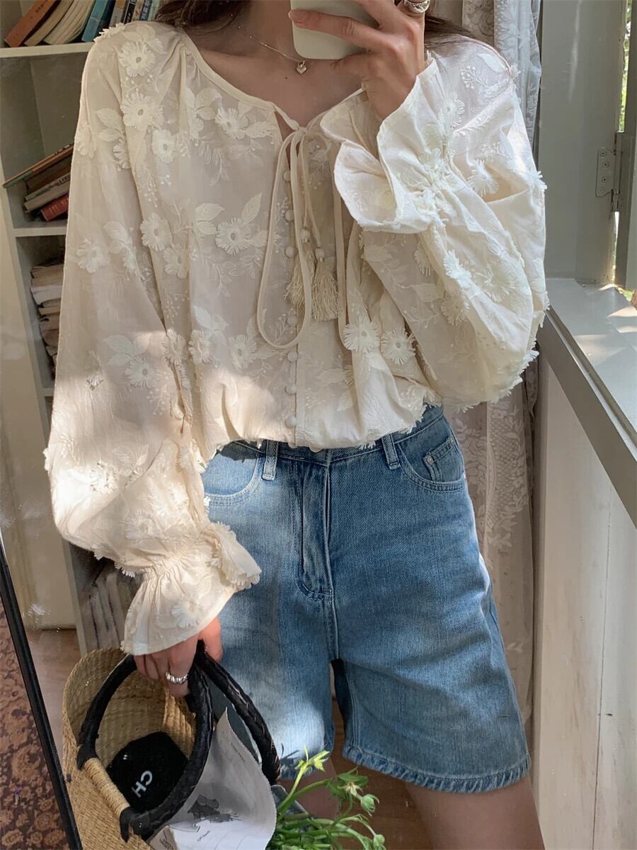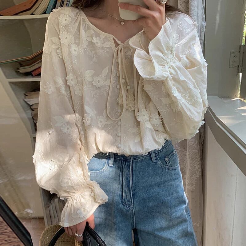 気質 V ネックレースアップ刺繍フラワーフレアスリーブシャツ 2024 ブラウスルーズトップシャツ レッド Vネック フラワーデザイン
