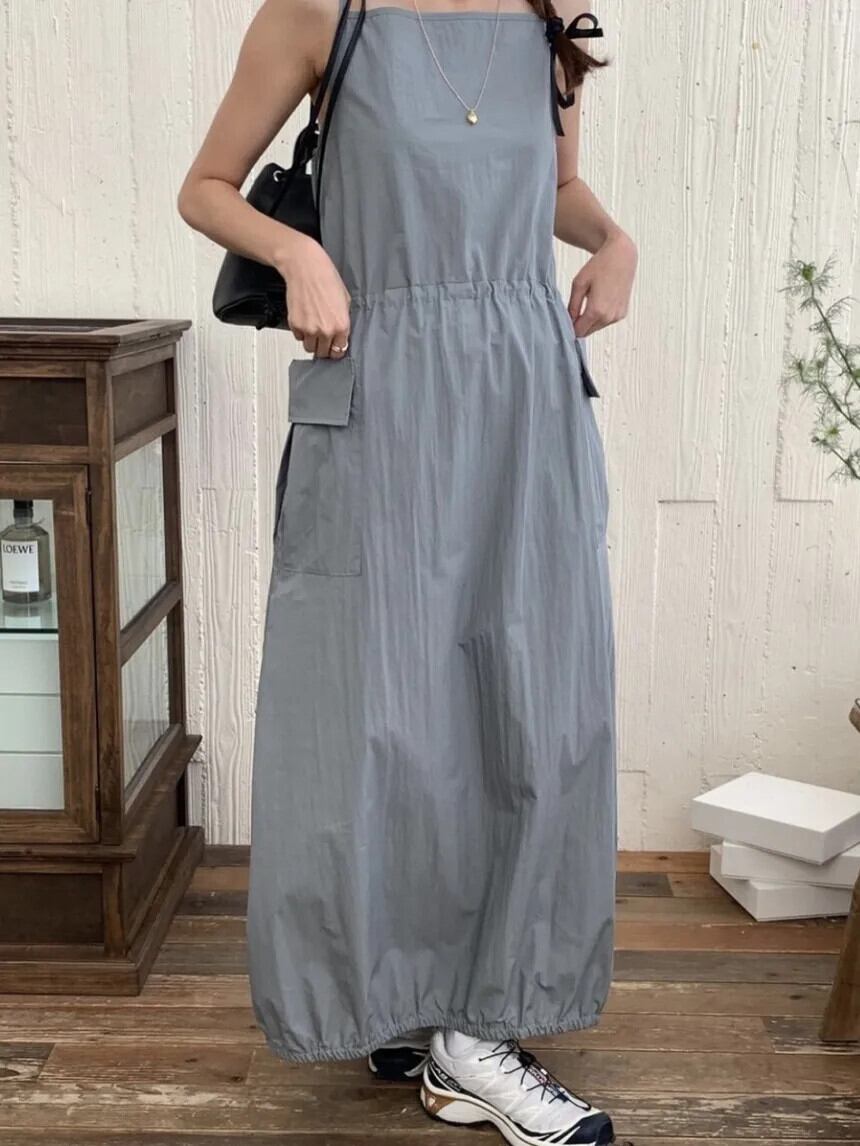 グレー Vestidos デ気質巾着大ポケットロングサスペンダードレス 2024 夏マキシ Y2k セクシー黒ドレス ブラック サマー 夏物