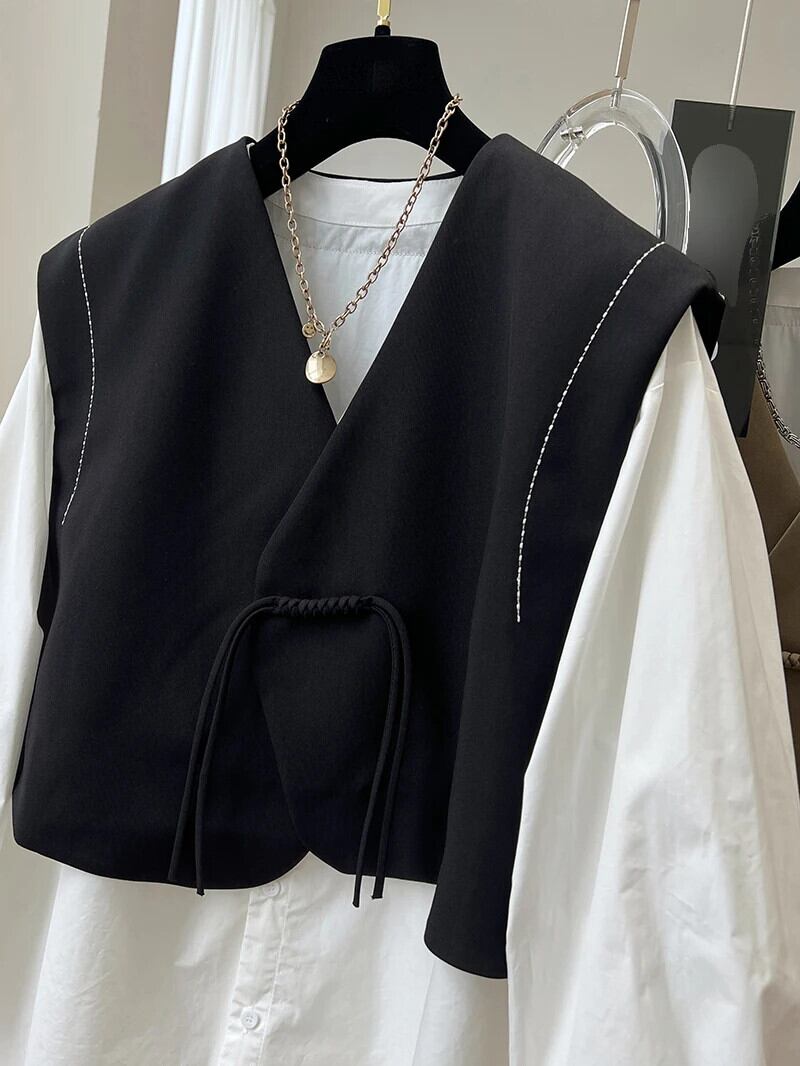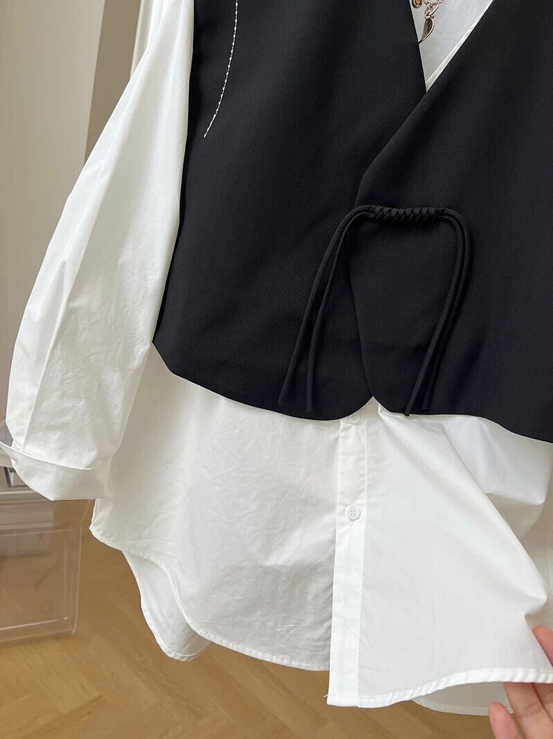 中国風バックルスーツベストツーピースセット白シャツ Chalecos パラ黒チョッキ Y2k トップス ホワイト ブラック